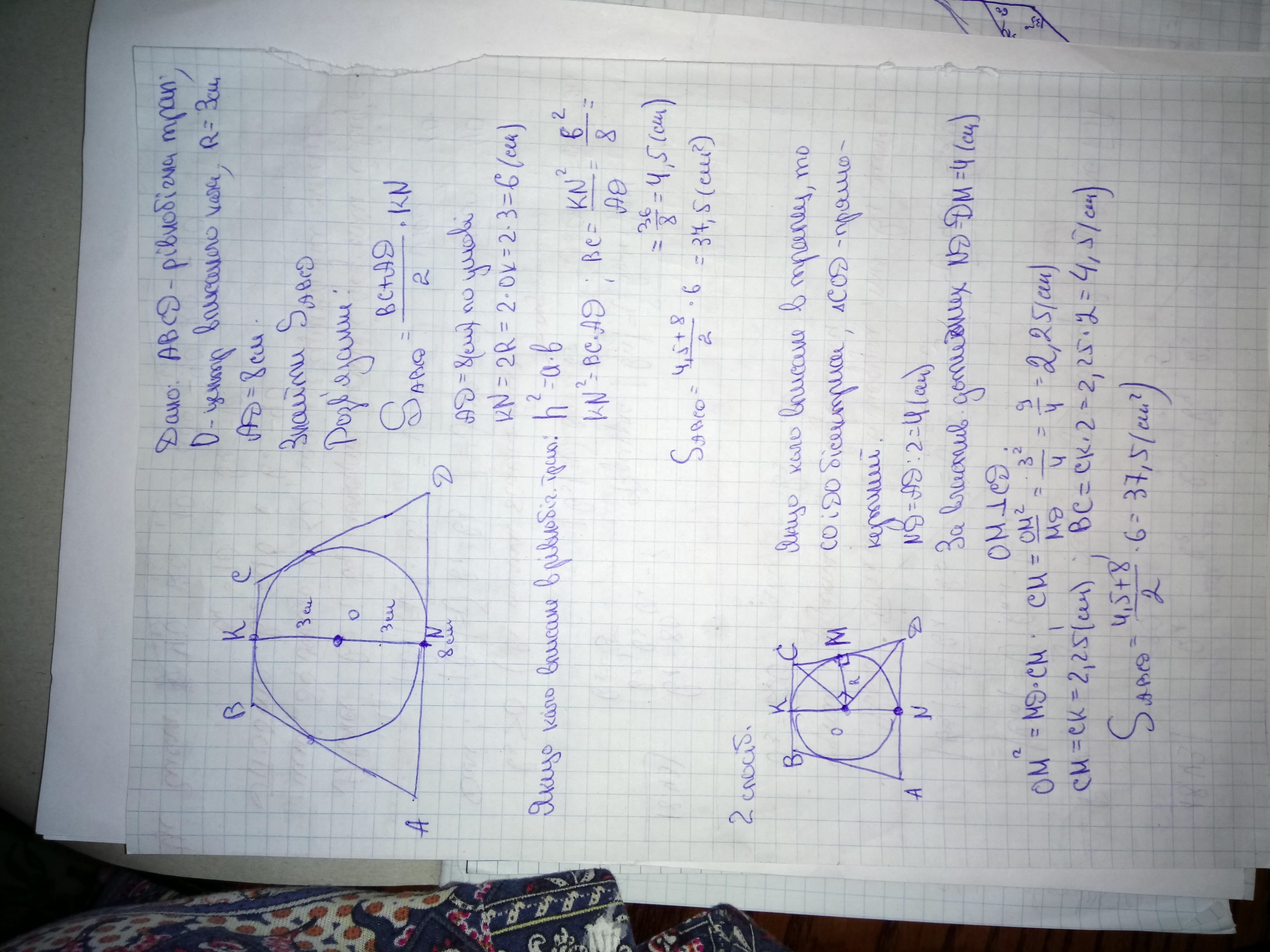 У рівнобічну трапецію вписане коло радіус якого 3см. Більша основа трапеції 8см. Знайти площу трапеції