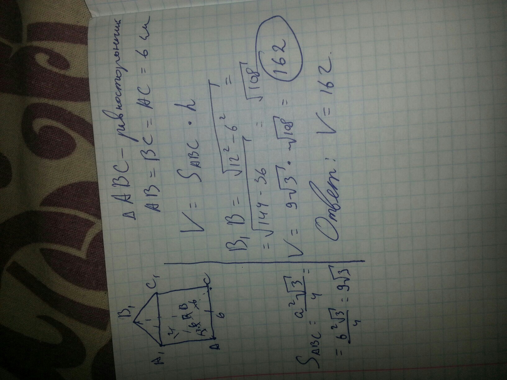 Угол между диагональю боковой грани правильной треугольной призмы и другой боковой гранью равен 30°. Найти объём призмы, если сторона её основания равна 6 см.