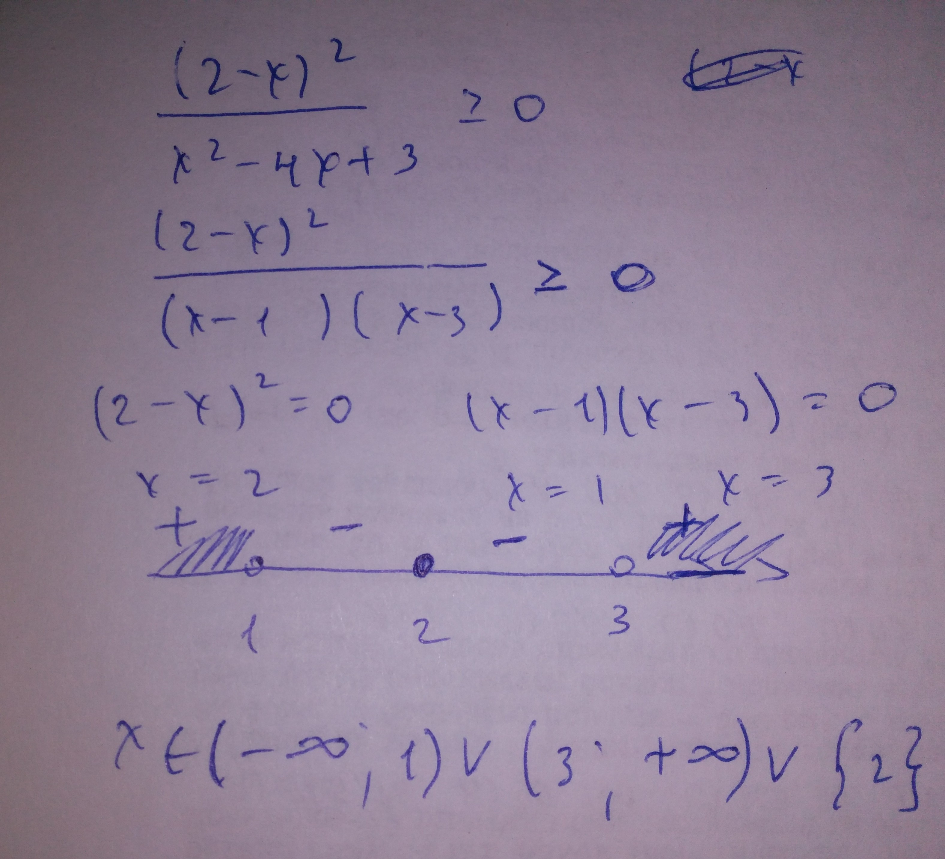 Ответ: x∈(-∞;1)∪{2}∪(3;+∞)