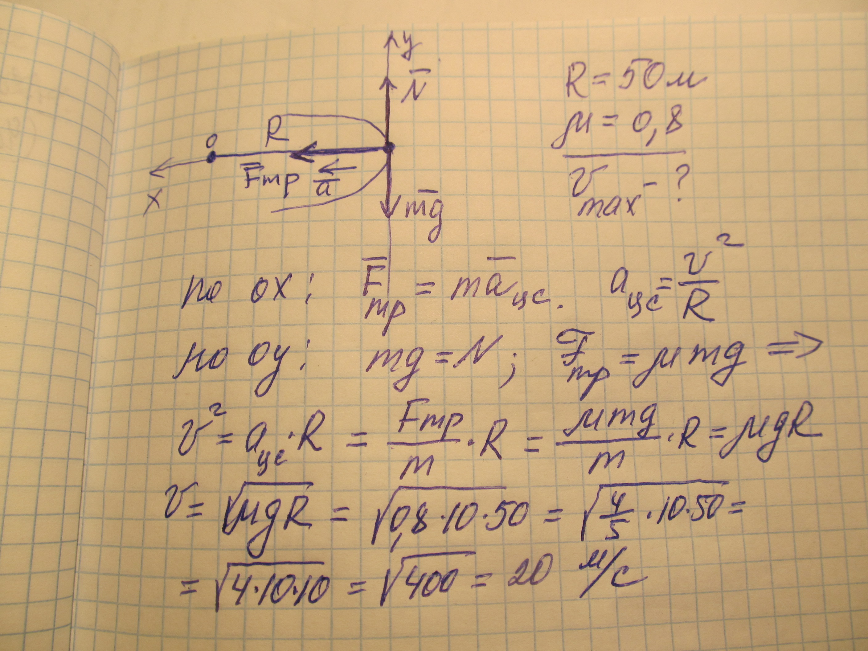Нужно обязательно чертежом!!!Автомобиль движется по участку дороги, имеющему форму дуги окружности, лежащей в горизонтальной плоскости.С какой максимальной скоростью автомобиль может пройти участок дороги, если радиус закругления R=50 м, а коэффициент трения между дорогой и колесами автомобиля μ=0,8?