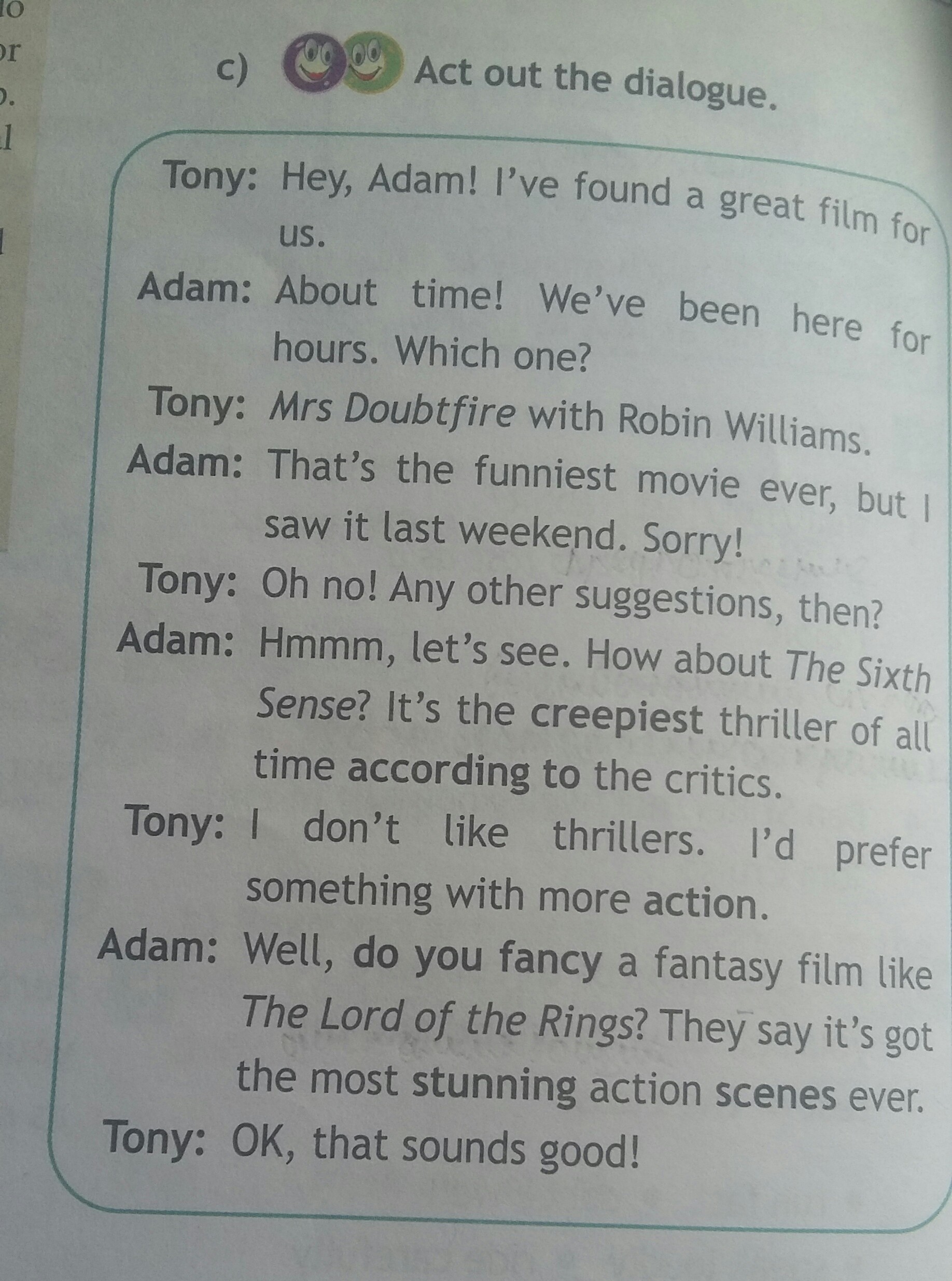 Тони: Эй, Адам! Я нашел отличный фильм для Адама: О времени! Мы здесь были здесь. Который из? Тони: Миссис Doubtfire с Робин Уильямс. Адам: Это самый смешной фильм, но видел его в прошлые выходные. Сожалею! Тони: О нет! Любые другие предложения? Адам: Хммм, посмотрим. Как насчет шестого чувства? По словам критиков, это самый страшный триллер за все время. Тони: Мне не нравятся триллеры. Я бы предпочел что-то с большим количеством действий. Адам: Ну, тебе фантастический фильм, как «Властелин Колец»? Говорят, у него самые потрясающие боевые сцены. Тони: Хорошо, это звучит хорошо!