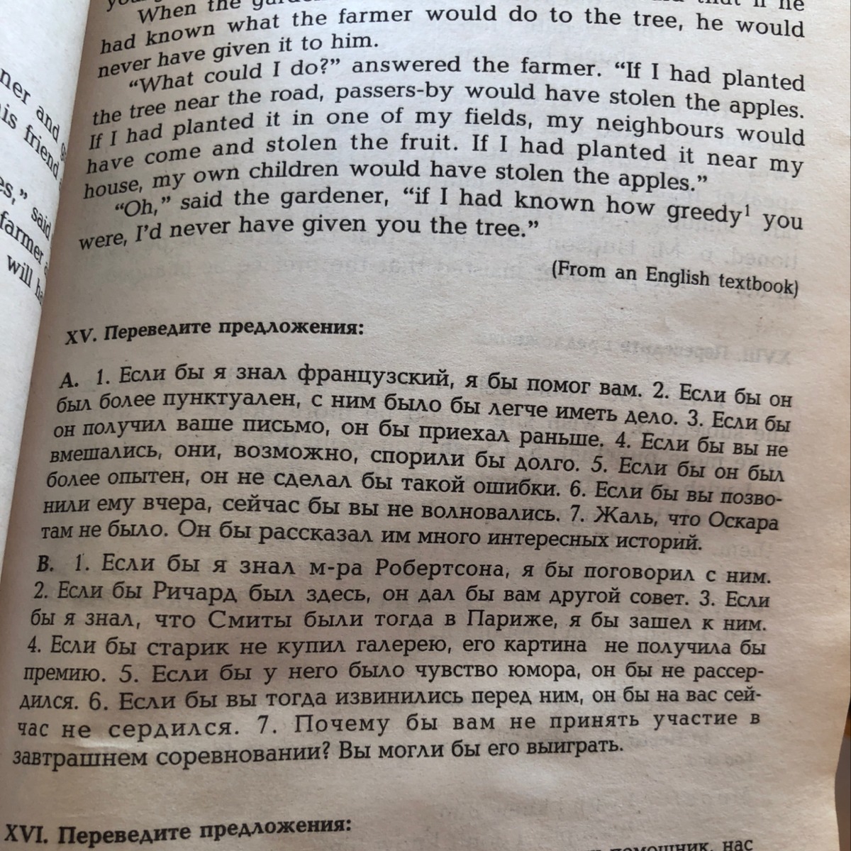 If it were French, I would help you. 2. If A. 1. more than a point alien, it would be easier to deal with it. 3. If he received your letter, he would have arrived before. 4. If you were not awake, they might have argued for a long time. 5. If he was more nimble, he would not make such a mistake. 6. If you let him yesterday, now you would not worry. 7. It's a pity that Oscar was not there. He would have told them a lot of interesting stories. W. 1. If I knew Mr. Robertson I would talk to him. 2. If Richard was here he would give you another advice. 3. If I knew that Smiths were then in Paris, I would go to them. 4. If the old man did not buy the gallery, his picture would not receive a premium. 5. If I had a sense of humor, I would not be angry. 6. If you then apologized to him, he would have been angry with you this time. 7. Why not take part in Tomorrow's competition? You could win it