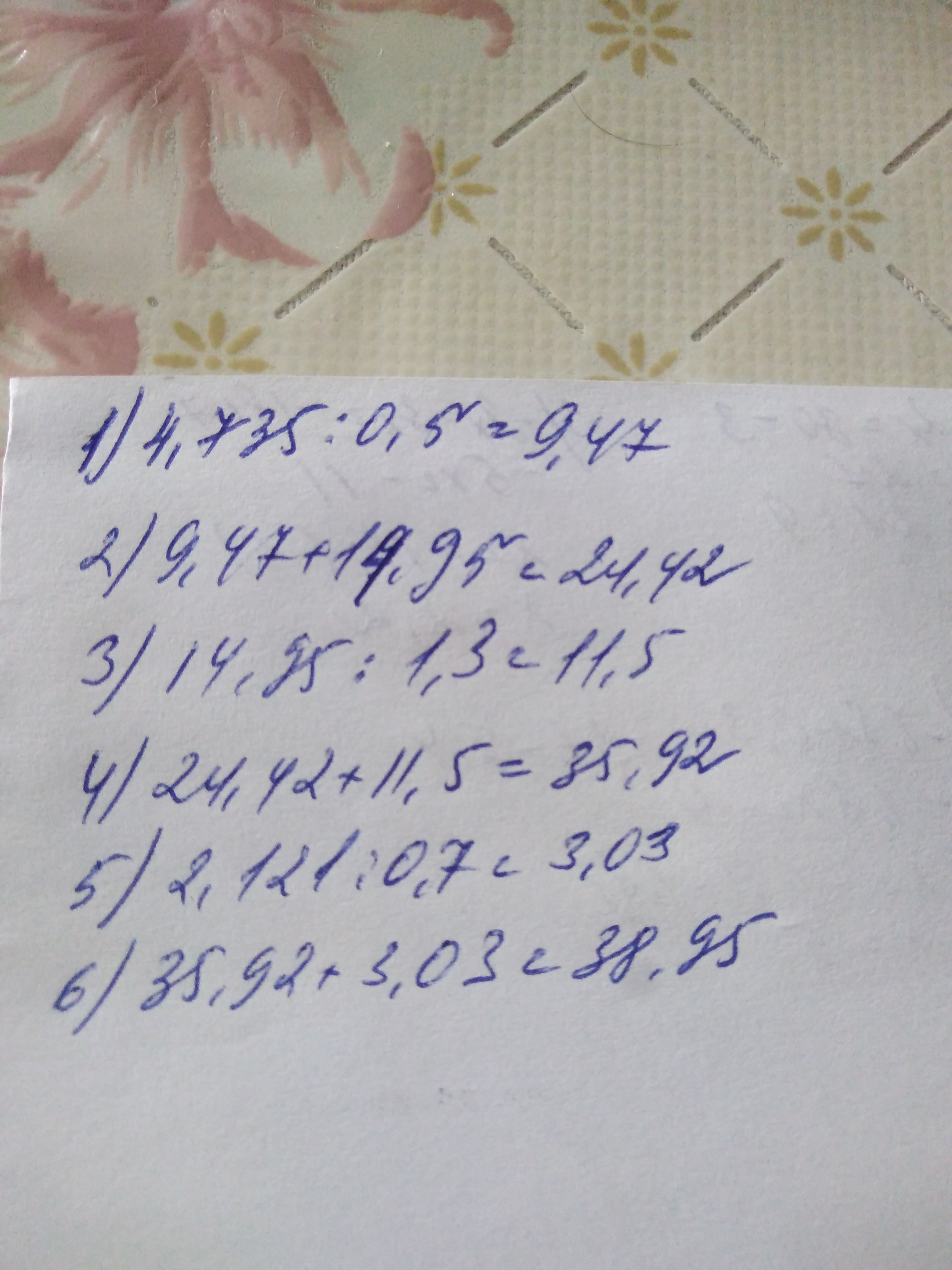 4,735 : 0,5 + 14,95 + 14,95 : 1,3 + 2,121 : 0,7 =