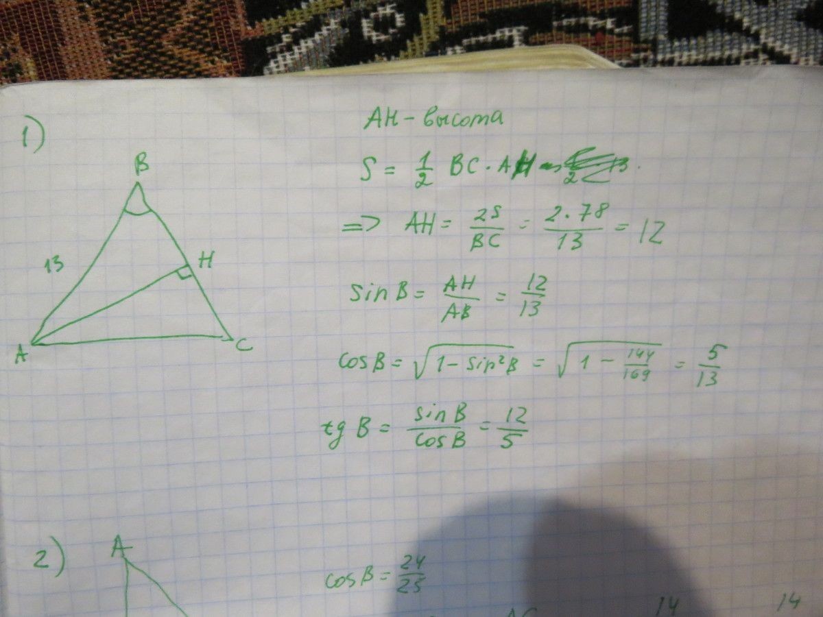 Найдите синус,косинус и тангенс угла при вершине равнобедренного треугольника,площадь которого равна 78 см квадратных,а боковая сторона -13 см.