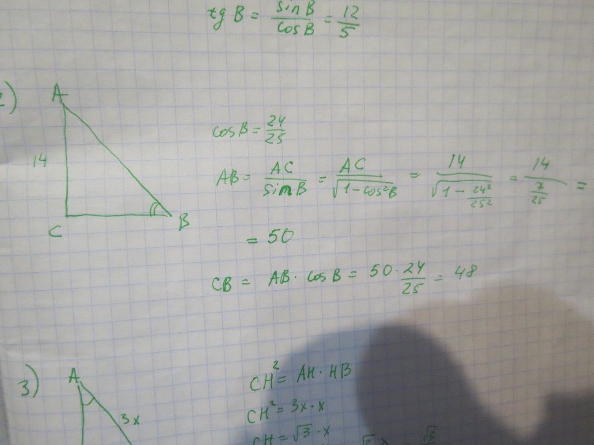Катет прямоугольного треугольника равен 14 см,а косинус противолежащего угла равен 24/25.Найдите другие стороны этого треугольника.