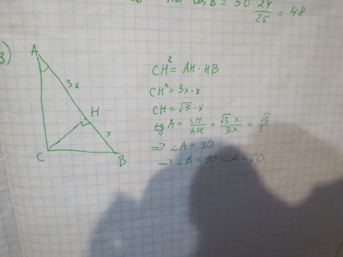Найдите острые углы прямоугольного треугольника,если проекций катетов на гипотенузе относятся как 3:1.