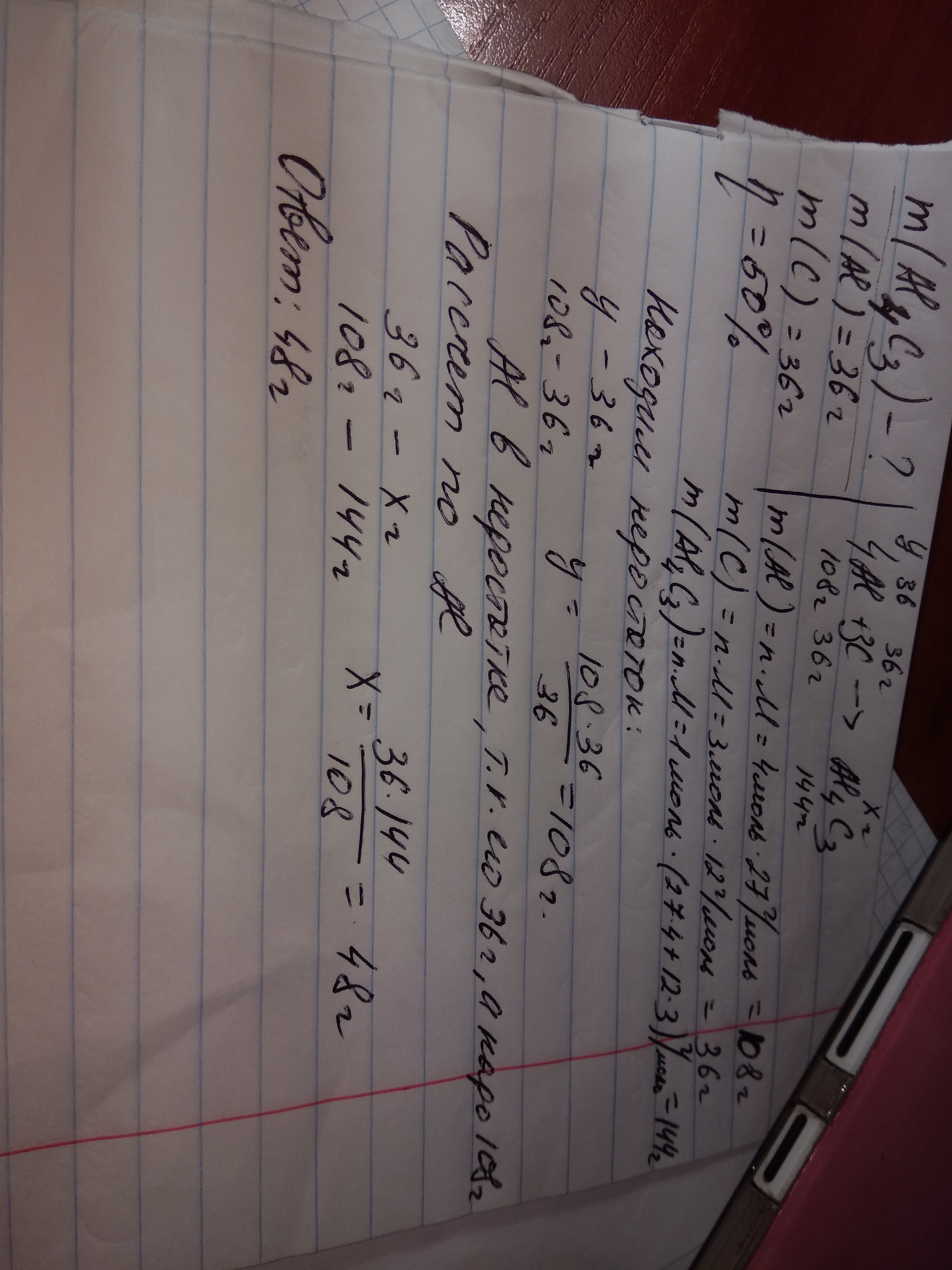 Сколько граммов карбида алюминия получится при взаимодействии 36г алюминия и 36г углерода? Выход продукта составляет 50%. Ar(C)=12, Ar(Al)=27