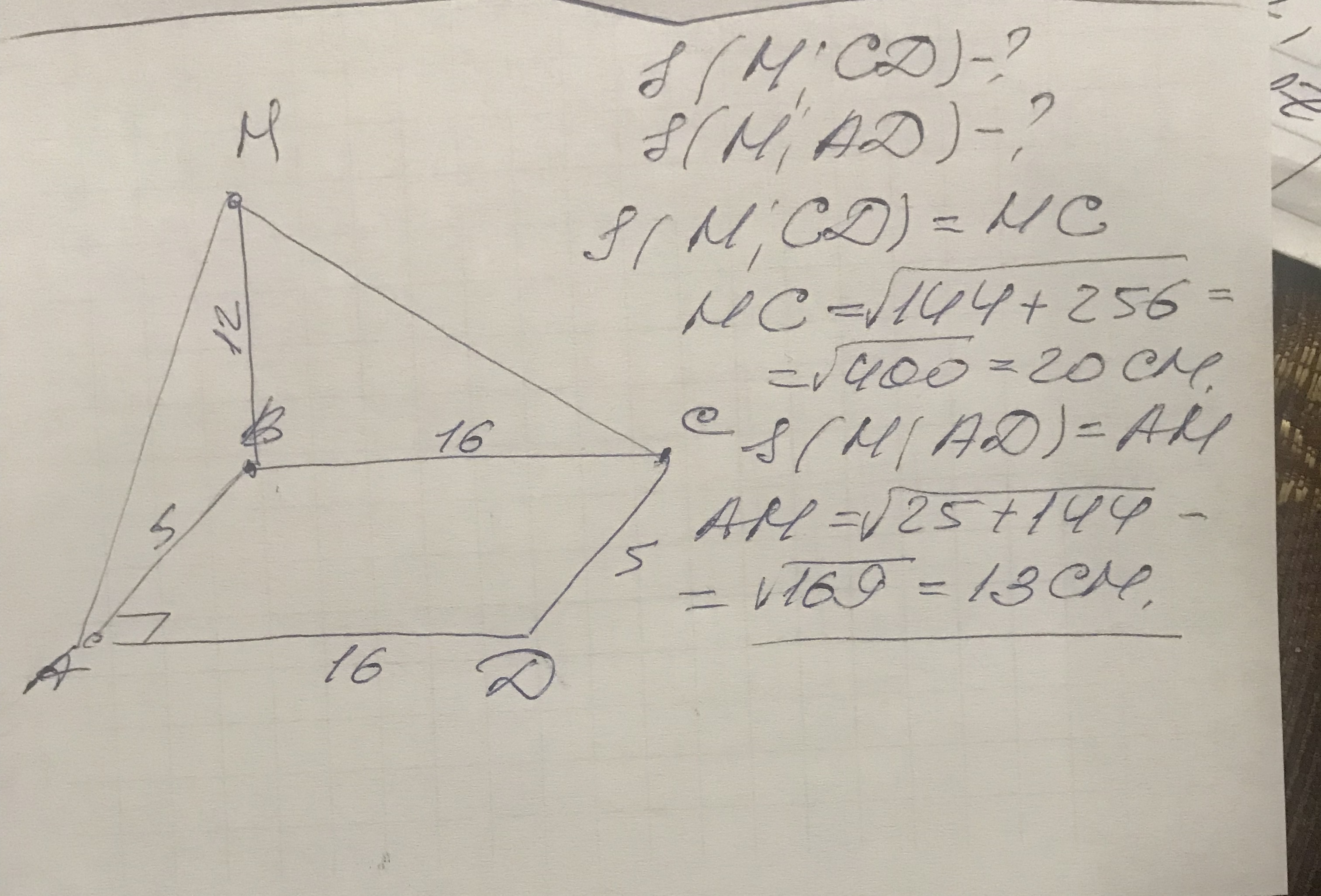 с вершины В прямоугольника АВСD проведены перпендикуляр ВМ к его плоскости. АВ = 5см., ВС = 16см, ВМ = 12см.Знайты расстояние от точки М до сторон СD И АD