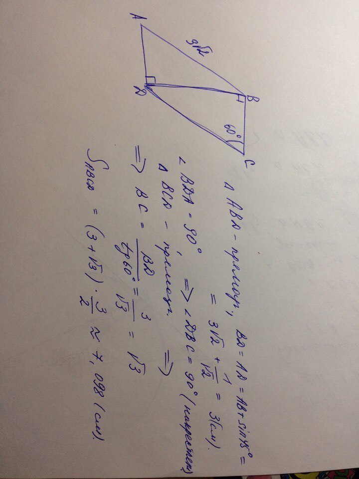 ПОЖАЛУЙСТА!!!!!!!!!!!!!!!!!!!!!!!!!!Диагональ BD трапеции ABCD равна большему основанию AD этой трапеции и перпендикулярна к нему. Найдите площадь трапеции, если AB= 3 корня из 2 см, угол С = 60 градусам.