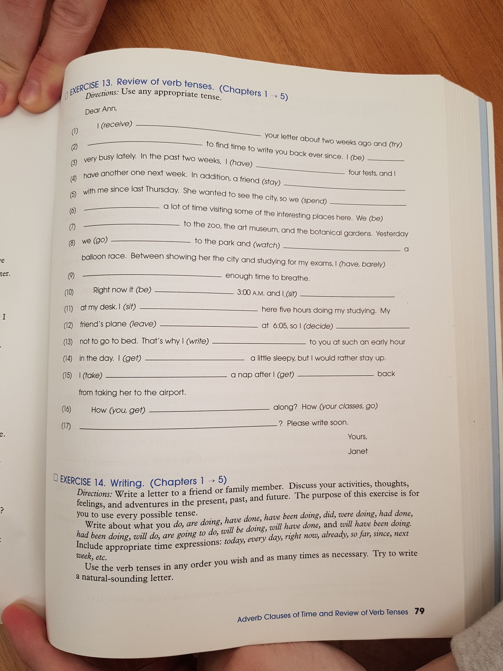 received, tried, have been, have had, stayed, spend, went, went, watched, have had barely, is, am sitting, sat, left, decided, wrote, got, took, got, did you get, are you classes going