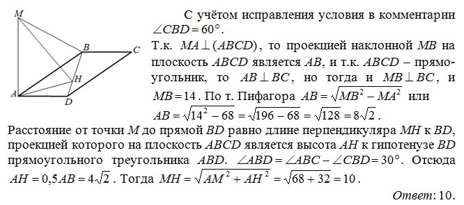 Из точки М к плоскости прямоугольника АВСД проведен перпендикуляр АМ длиной √68. Расстояние от точки М до ВС равно 14, ∠СВД равен 30°. Чему равно расстояние от точки М до прямой ВD?