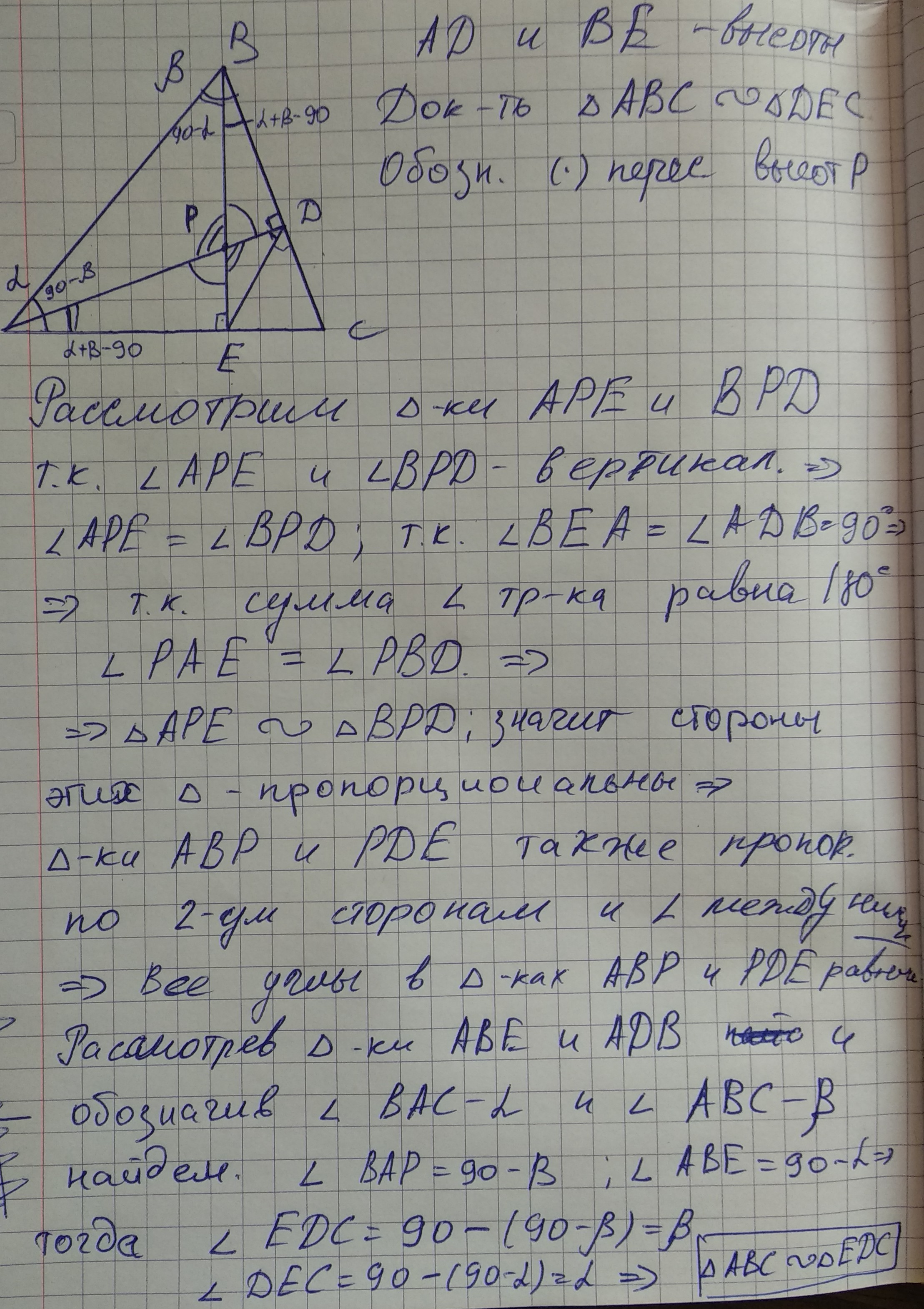 в треугольнике ABC проведены высоты AD и BE . Доказать , что треугольник ABC подобен треугольнику DEC