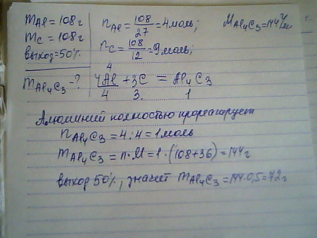 Сколько граммов карбида алюминия получится при взаимодействии 108г алюминия и 108г углерода? Выход продукта составляет 50%. Ar(C)=12, Ar(Al)=27