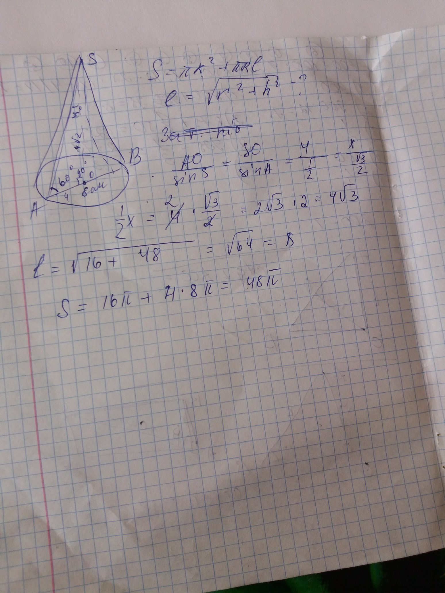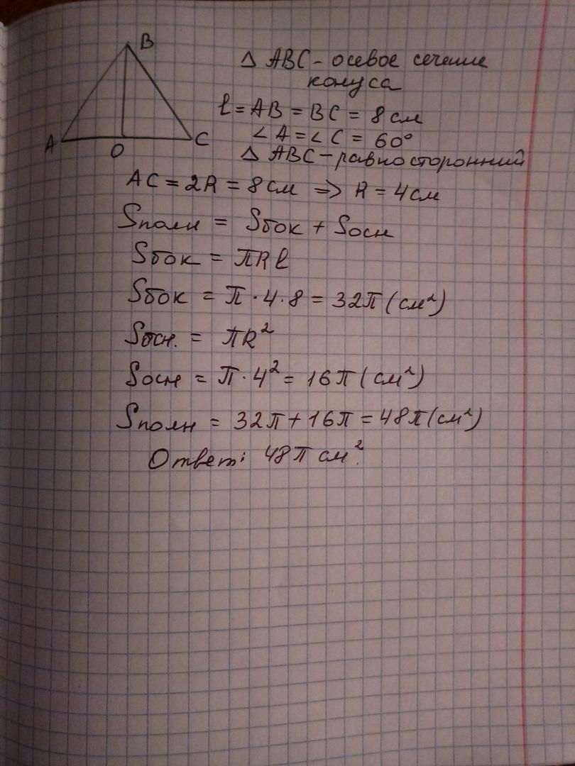 твірна конуса дорівнює 8 см і утворює з площиною основи кут, що дорівнює 60°. знайдіть повну поверхню конуса