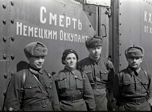 3. Мальчика с девушкой - на фоне поезда с надписью: "смерть фашистским оккупантам".