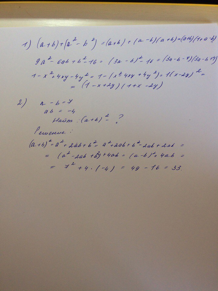 2)Известно, что a-b=7,ab=-4. Найдите значение выражения (a+b)^2