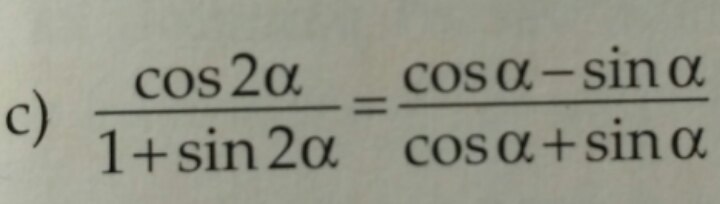 frac{Cos2 alpha }{1+Sin2 alpha }= frac{Cos ^{2} alpha -Sin ^{2} alpha   }{Sin ^{2}  alpha+Cos ^{2} alpha +2Sin alpha Cos alpha  }=  frac{(Cos alpha -Sin alpha )(Cos alpha +Sin alpha )}{(Cos alpha +Sin alpha ) ^{2} } =  = frac{Cos alpha -Sin alpha }{Cos alpha+Sin alpha } \\ frac{Cos alpha -Sin alpha }{Cos alpha +Sin alpha }= frac{Cos alpha -Sin alpha }{Cos alpha +Sin alpha }