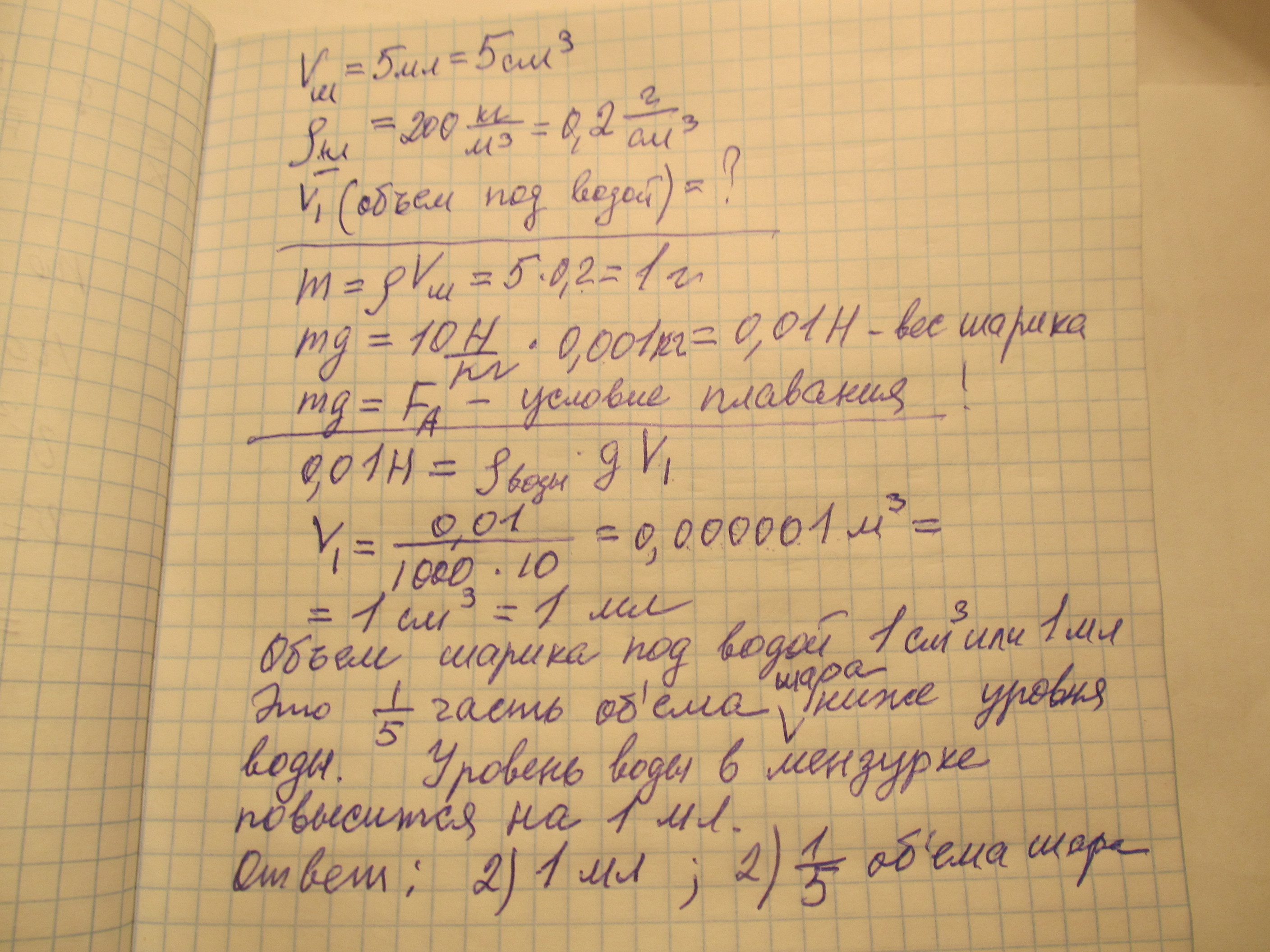 На сколько миллилитров поднимется уровень воды в мерном цилиндре, если в него забросить пробковый шарик объемом 5 мл и плотностью 200 кг/м3 ? Уровень воды поднимется на 1. 5мл 2. 1мл 3. 2мл 4. 3мл