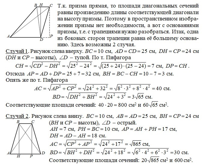 основанием прямой призмы является трапеция основания которой 25см и 10см. Одна из боковых сторон трапеции равна 25см, а высота 24см. Определить площади диагональных сечений этой призмы, если высота призмы равна 20см
