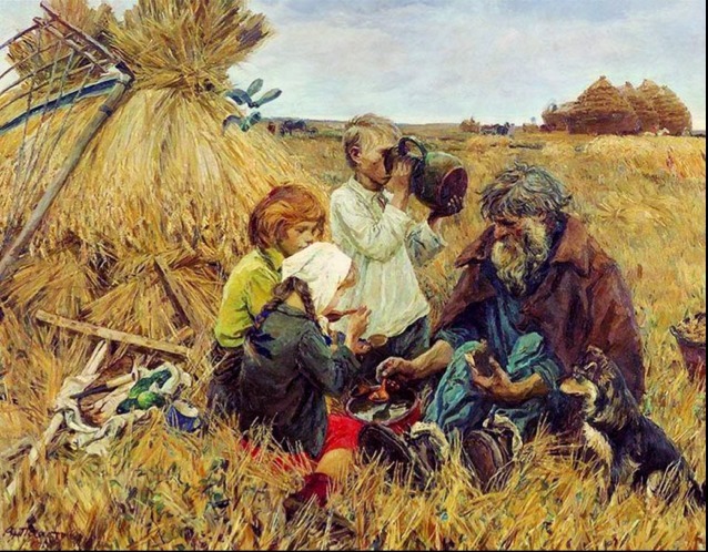 Но больше всего привлекает к себе внимание первый план картины. Возле высоко снопа расположилась семейка. Старый дедушка, два мальчика и девочка. Дедушка очень старый, у него седая длинная борода, густые нерасчесанные волосы и очень натруженные руки. В одной он держит кусок черного хлеба, а второй зачерпывает ложкой еду. Одет он очень странно, так как на улице лето и слишком жарко, а на нем синий рабочий костюм, поверх накинута коричневая куртка, а на ногах ботинки. Возможно, это для того, чтобы не поцарапать ноги и руки. Дети одеты немного легче. На мальчиках легкие рубашки и штаны, а девочка в красном платье и кофточке. На голове у нее платок. Светленький мальчик пьет с кувшина воду или молоко. Это старый глиняный кувшин, в нем напиток может очень долго оставаться прохладным, что очень удобно в такую жару.