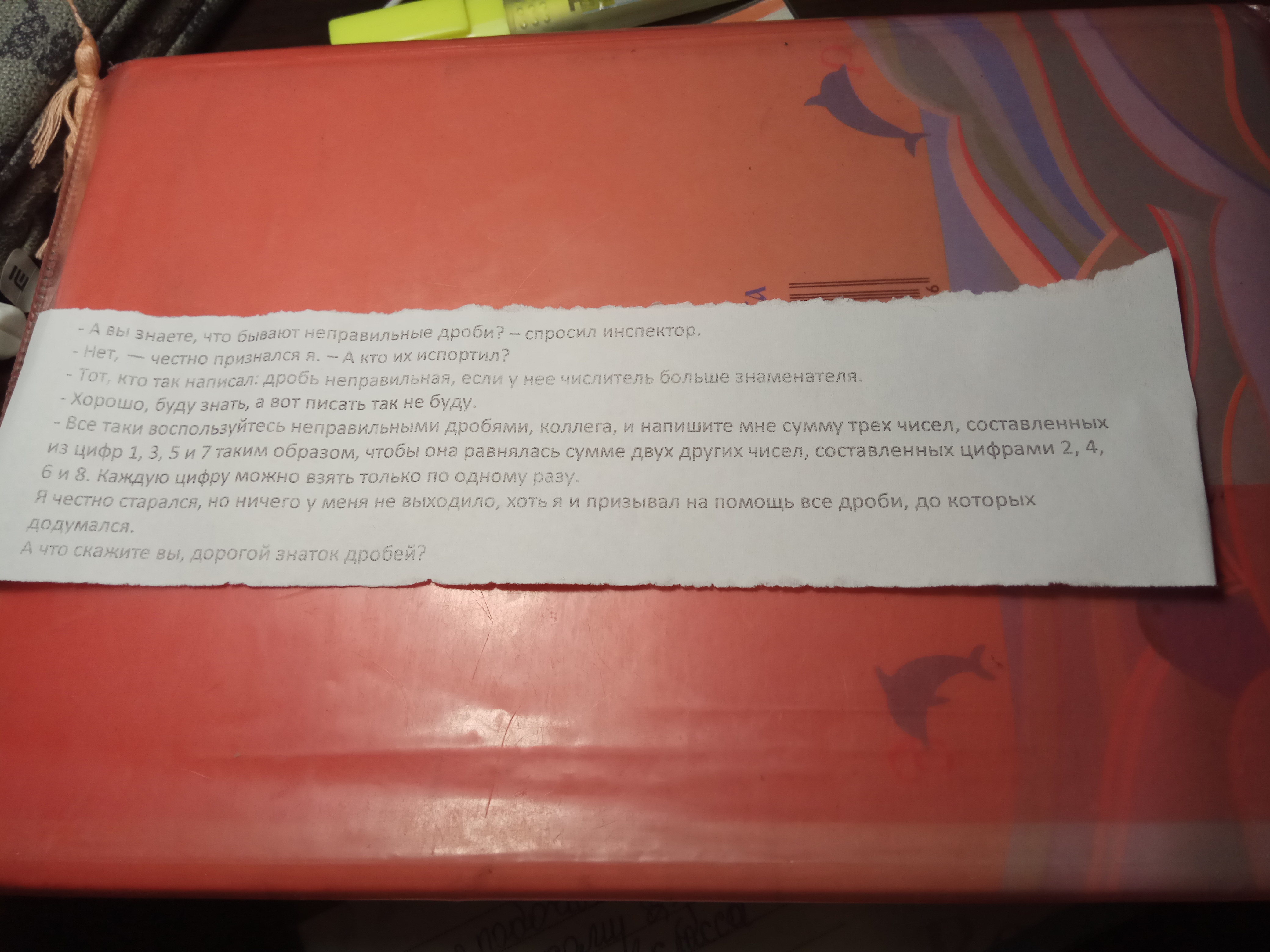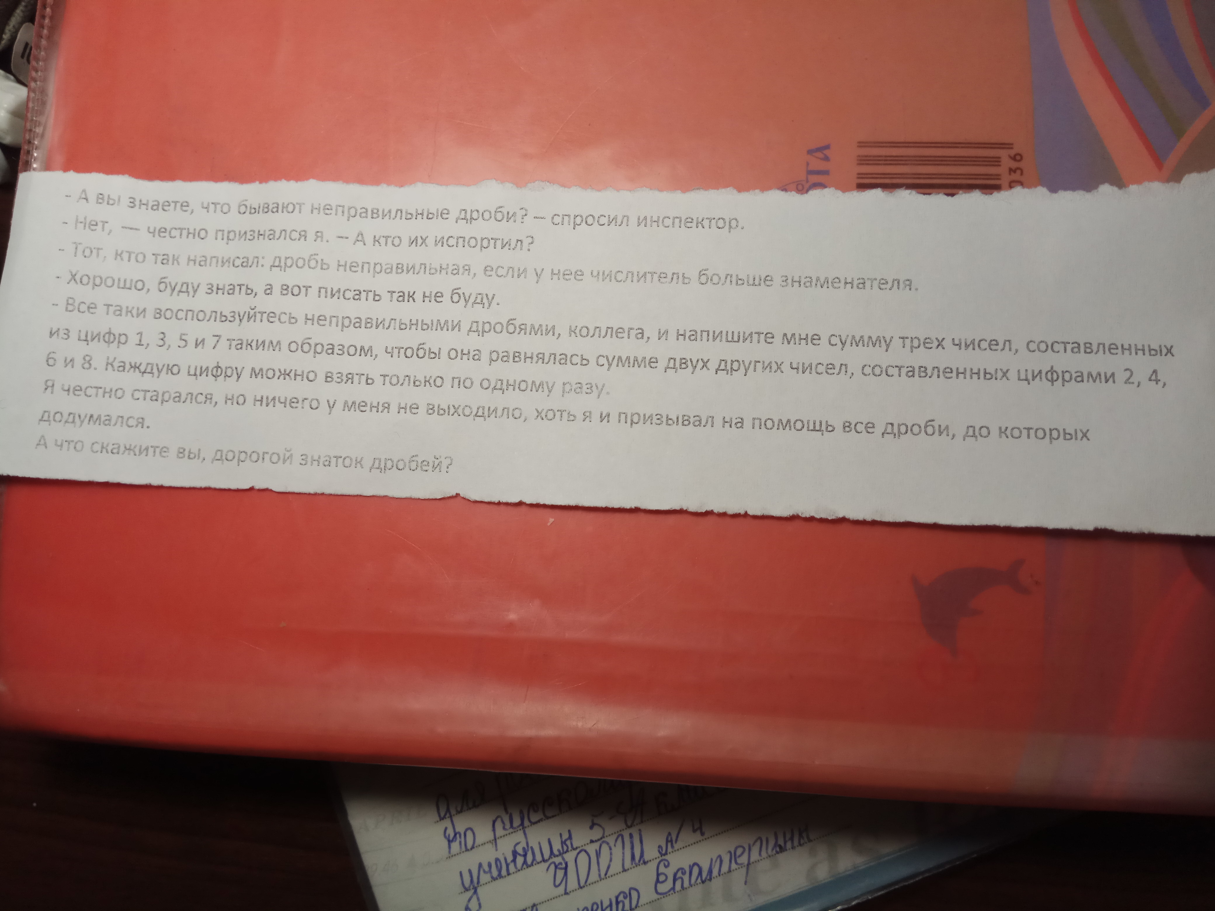 Воспользовавшись неправильными дробями нужно написать сумму ТРЁХ чисел составленных из 1;3;5;и 7 , чтобы она равнялась сумме ДВУХ чисел 2;4;6;8.