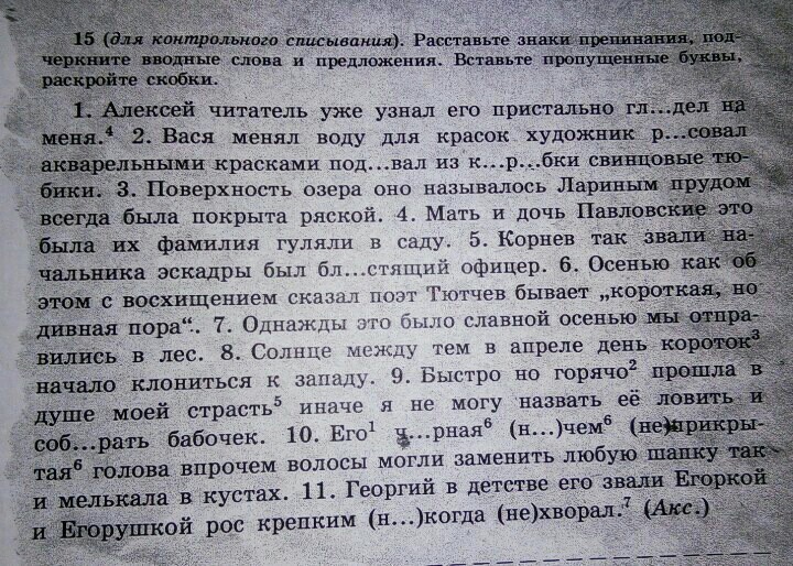 1. Алексей (читатель уже узнал его) глядел на меня. 2. Вася менял воду для красок (художник рисовал акварельными красками) подавал из коробки свинцовые тюбики. 3. Поверхность озера - оно называлось Лариным прудом - всегда была покрыта ряской. 4. Мать и дочь Павловские - это была их фамилия - гуляли в саду. 5. Корнев - так звали начальника эскадры - был блестящий офицер. 6. Осенью - как об этом с восхищением сказал поэт Тютчев - бывает „короткая, но дивная пора“. 7. Однажды (это было славной осенью) мы отправились в лес. 8. Солнце, (между тем в апреле день короток) начало клониться к западу. 9. Быстро, но горячо прошла в душе моей страсть - иначе я не могу назвать её - ловить и собирать бабочек. 10. Его чёрная, ничем не прикрытая голова (впрочем, волосы могли заменить любую шапку) так и мелькала в кустах. 11. Георгий (в детстве его звали Егоркой и Егорушкой) рос крепким, никогда не хворал.