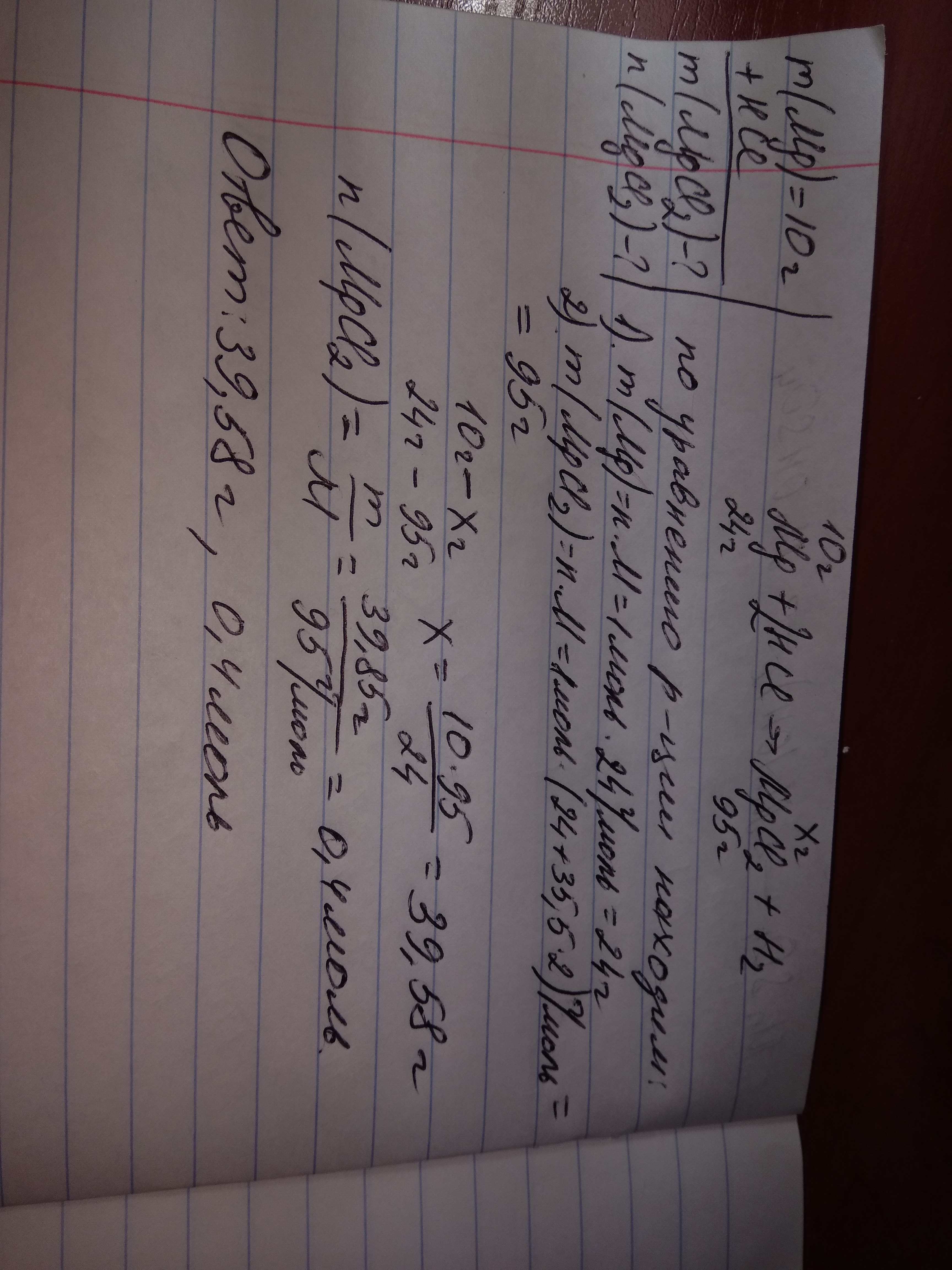 Вычислите массу и количество вещества соли которая образуется при взаимодействии 10грам магния с соляной кислотой