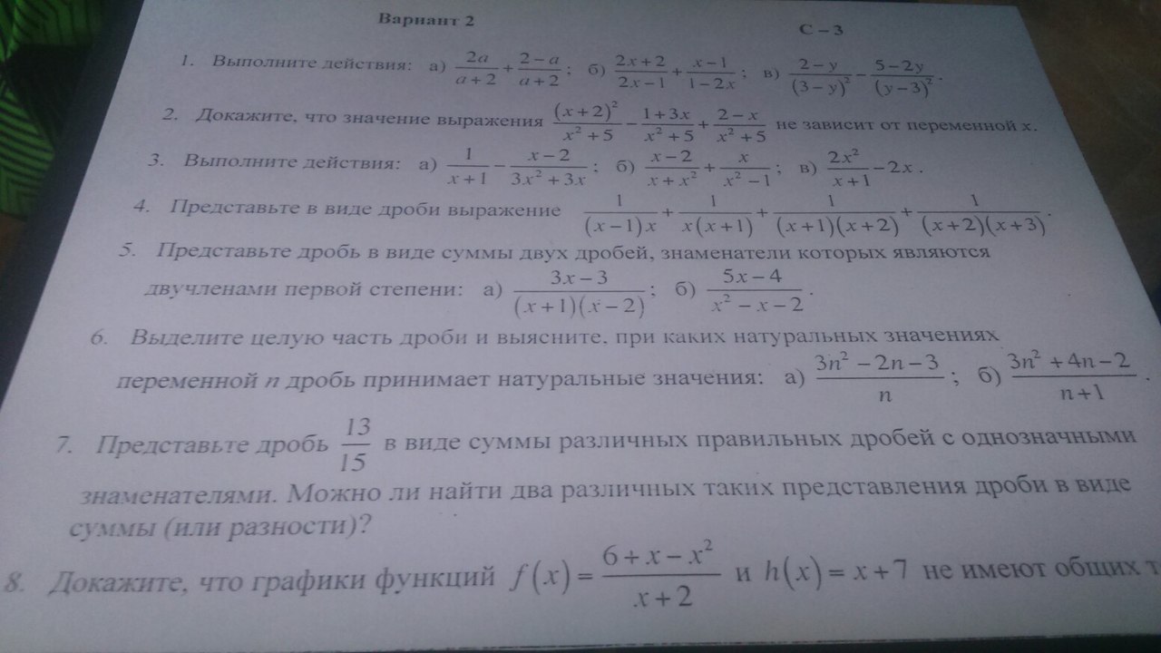 2); ; frac{(x+2)^2}{x^2+5}-frac{1+3x}{x^2+5}+frac{2-x}{x^2+5}=frac{x^2+4x+4-1-3x+2-x}{x^2+5}=frac{x^2+6}{x^2+5}\\3); ; frac{1}{x+1}-frac{x-2}{3x^2+3x}=frac{1}{x+1}-frac{x-2}{3x(x+1)}=frac{3x-x+2}{3x(x+1)}=frac{2x+2}{3x(x+1)}=\=frac{2(x+1)}{3x(x+1)}=frac{2}{3x}\\frac{x-2}{x+x^2}+frac{x}{x^2-1}=frac{x-2}{x(x+1)}+frac{x}{(x-1)(x+1)}=frac{(x-2)(x-1)+x^2}{x(x+1)(x-1)}=\=frac{2x^2-3x+2}{x(x+1)(x-1)}\\frac{2x^2}{x+1}-2x=frac{2x^2-2x(x+1)}{x+1}=frac{2x^2-2x^2-2x}{x+1}=-frac{2x}{x+1}