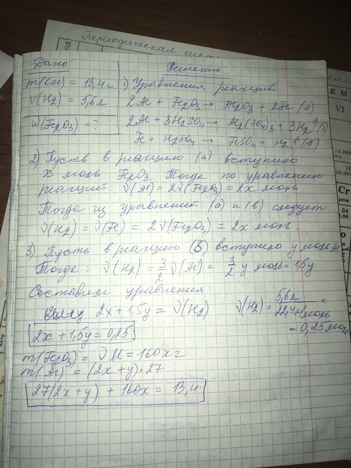 Оксиджелеза 3 смешали с избытком алюминия полученную смесь измельчили, навеску смеси m=13.4 гр подожгли.Полученный после бурной реакции остаток охладили и растворили в разбавленной серной кислоте,выделилось 5,6 литров газа.Определить массовую долю оксида железа три в исходной