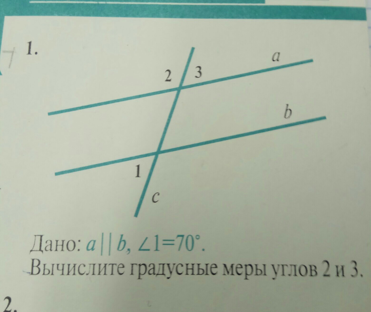 <1=<3 - как накрест лежащие при параллельных прямых, <2+<3=180, тогда <2=180-<3=180-70=110,