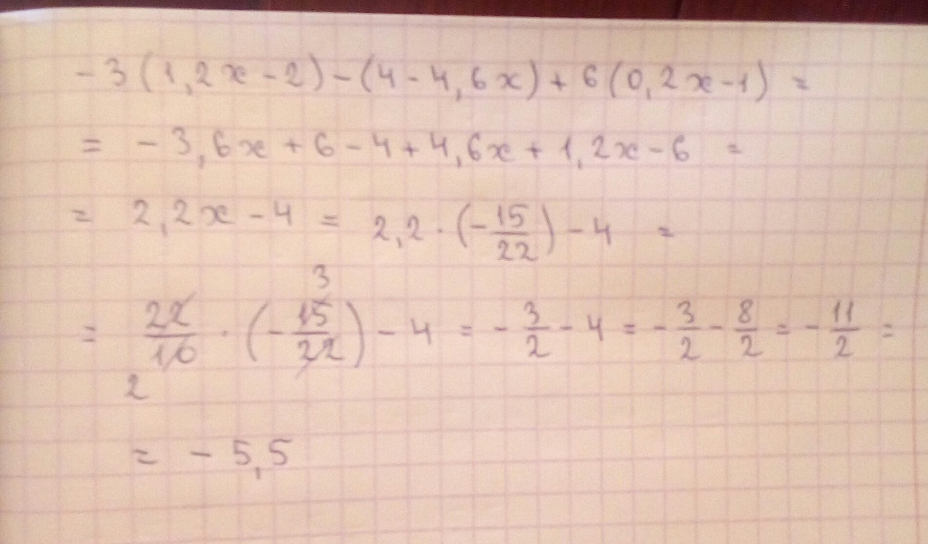 упростить выражение -3(1,2икс-2)-(4-4,6икс)+6(0,2икс-1)и вычислить его значение при икс равно минус пятнадцать двадцать вторых