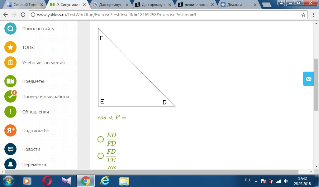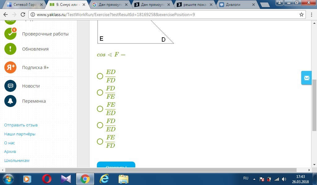 косинус - отношение прилегающей стороны к гипотенузе. Прилегающая - фе, гипотенуза - фд