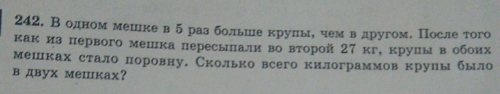 х кг во втором мешке, тогда в первом 5х кг. Из первого пересыпали 27 кг - (5х-27) кг, во второй насыпали 27 кг - (х+27) кг. Стало поровну. Составляем уравнение: