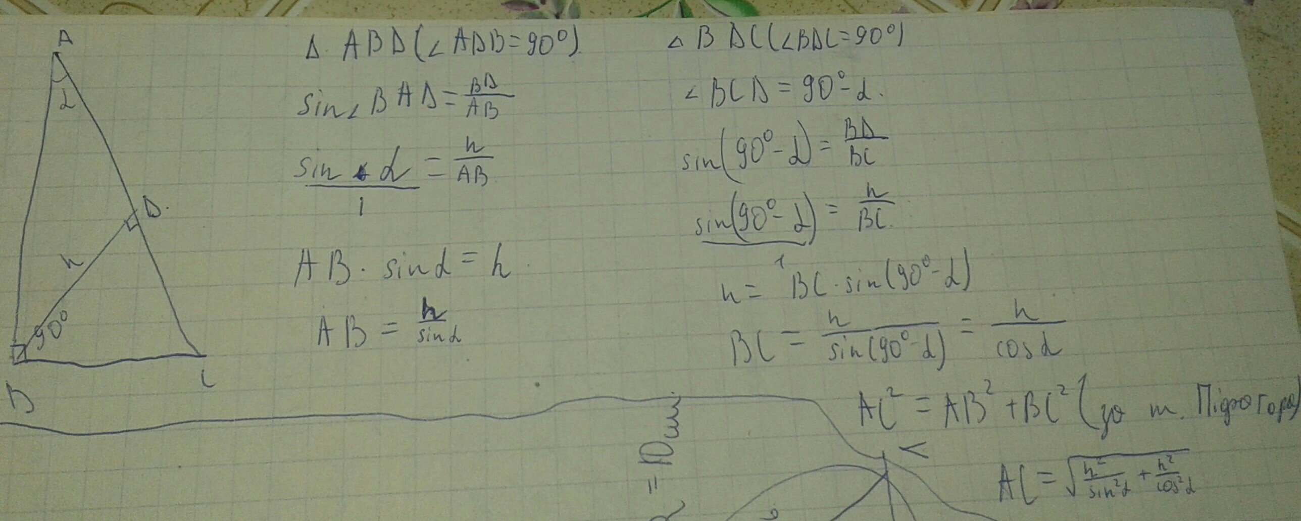 дано: уголABC=90°; BDперпендикуляренАC; BD=h;уголА=альфа. Найти: стороны треугольника АВС