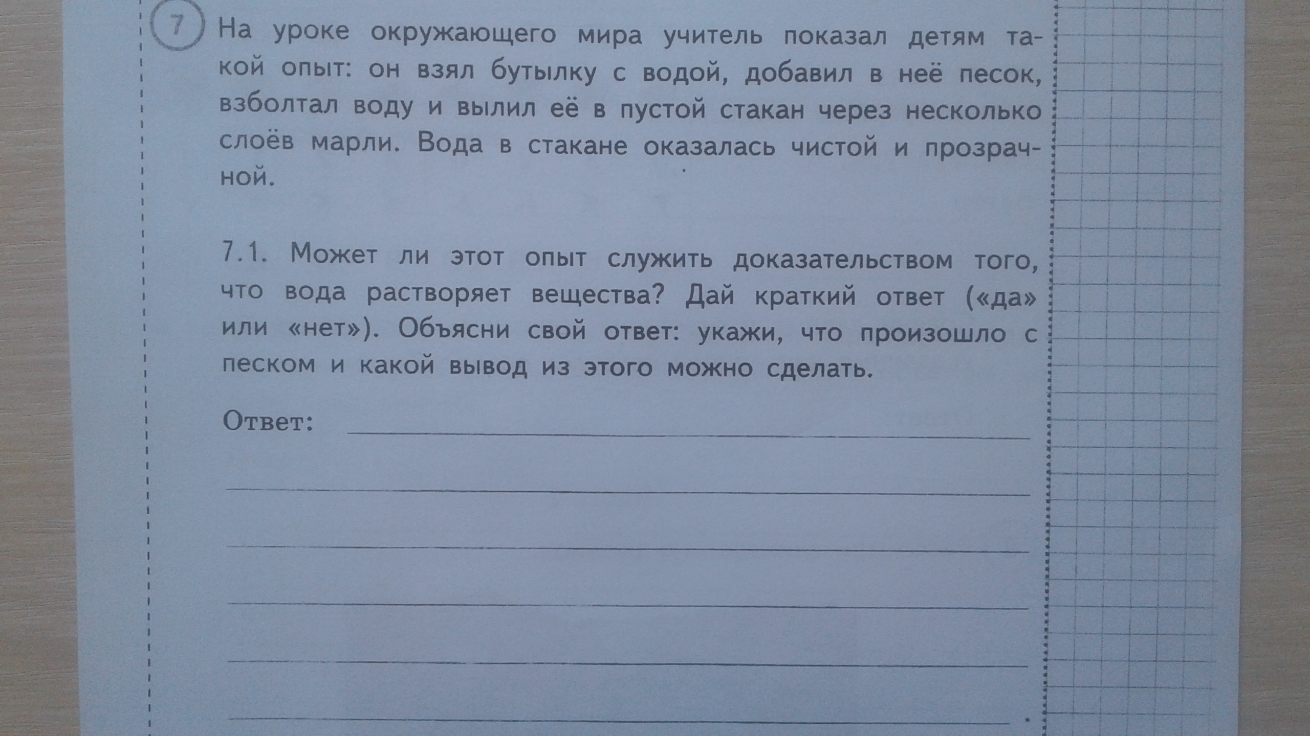 Вывод: песок не растворяется в воде. Он оседает на марле, а вода, проходя через слой песка, даже очищается, стекая в стакан.