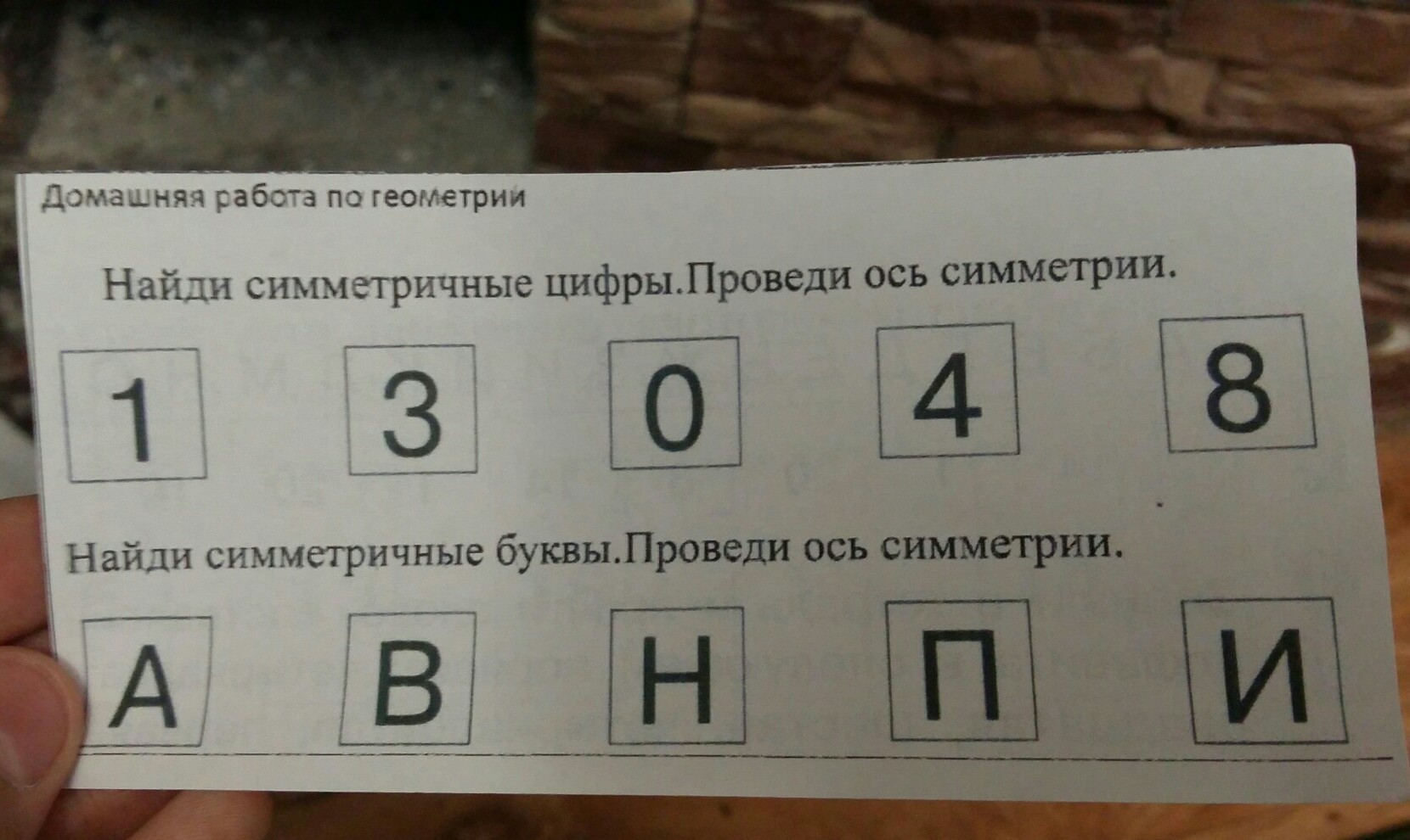найдите симметричные буквы. проведи ось симметрии А В Н П И