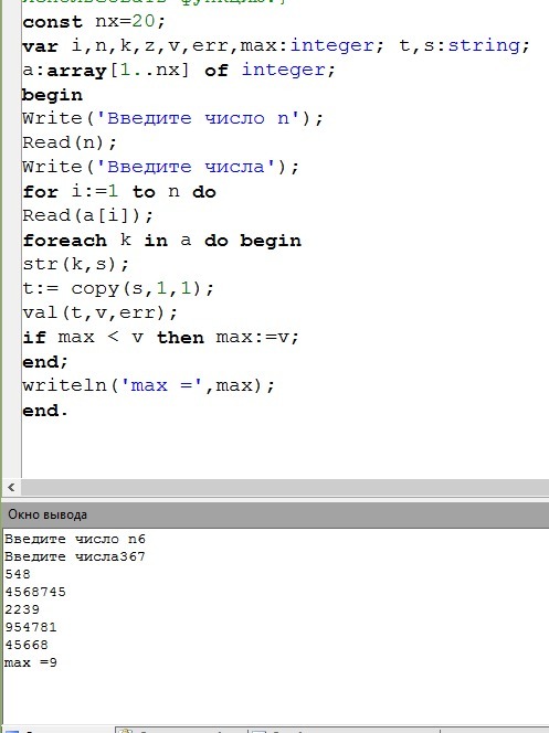 const nx=20;var i,n,k,z,v,err,max:integer; t,s:string;a:array[1..nx] of integer;beginWrite('Введите число n');Read(n);Write('Введите числа');for i:=1 to n doRead(a[i]);foreach k in a do beginstr(k,s);t:= copy(s,1,1);val(t,v,err);if max < v then max:=v;end;writeln('max =',max);end.