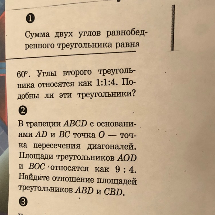 2.Треугольники ABD и CBD имеют общую высоту, тогда их площади относятся как AD/BC, т.е. как длины соответственных оснований. Треугольники AOD и BOC подобны, а коэффициент подобия равен квадратному корню отношения площадей, то есть 3/2. Тогда AD/BC=3/2, что и требовалось.