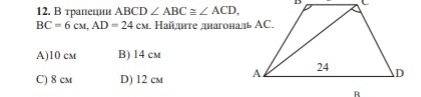 ΔАВС подобен Δ ACD (по двум углам ∠АВС=∠ACD, ∠ВСА=∠CAD-вертикальные углы) ⇒ АС/ВС=AD/AC AC²=BC·AD AC²=6·24=144 AC=12