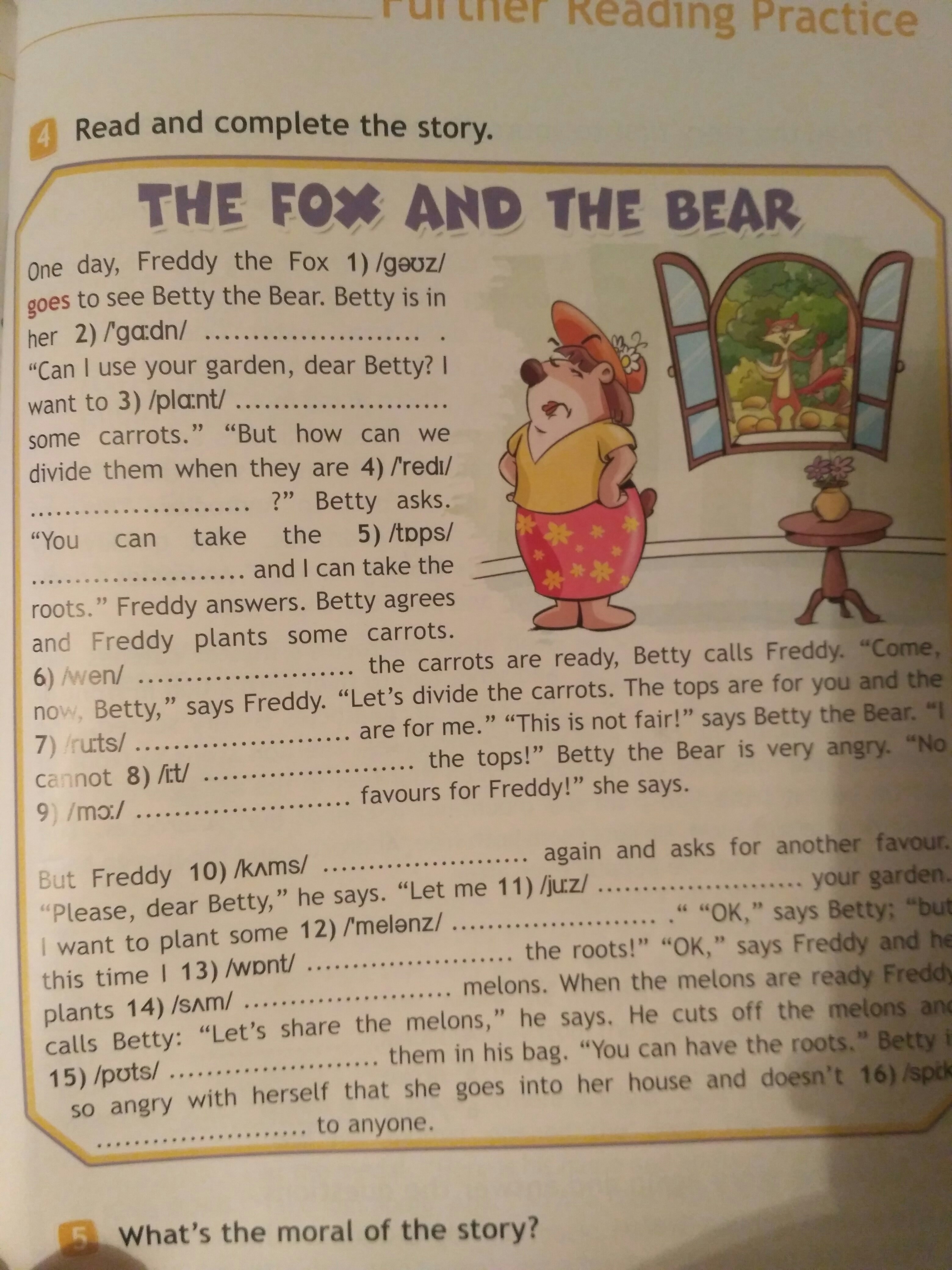 Однажды Фредди-лиса идет к Бетти-медведице. Бетти у себя в саду. "Могу ли я использовать твой сад, Дорогая Бетти, я хочу посадить несколько морковок? ". Бетти спрашивает. "Но как мы сможем потом их разделить, когда они будут готовы? ". Фредди отвечает. "Ты можешь взять вершки, я могу взять корешки". Когда морковь поспела, Бетти зовет Фредди. "Приходи сейчас Бетти", говорит Фредди. "Давай делить морковь, Вершки для тебя, а корешки мне". "Это не справедливо", говорит Бетти-медведица. "Я не могу есть вершки". Бетти очень сердита. "Больше никакой благосклонности к Фредди" она сказала. Но фреди идет и спрашивает о другой благосклонности. " Пожалуйста, дорогая Бетти", он говорит. "Позволь мне использовать твой сад. Я хочу посадить несколько дынь. Хорошо, но в этот раз мне корешки. " ок, говорит Фредди. Когда дыни поспели, фредди зовет бетти "Давай делить дыни", говорит он. Он отрезает дыни и помещает их в его сумку. " Ты можешь взять корешки". Бетти так сердита с собой, что она идет в ее дом и не обращается к кому-либо.