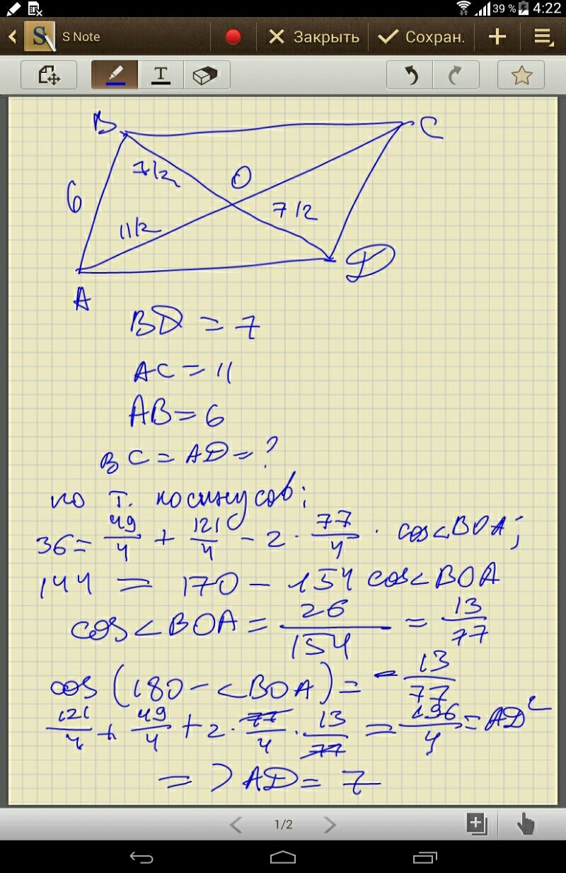 Диагонали параллелограмма равны 7 и 11 с, а одна из сторон - 6 см. Найдите другую сторону параллелограмма.