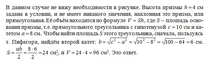 Знайти об'єм призми в основі якої лежить прямокутний трикутника з гіпотенузою 10см і катетом 8см. Висота призми =4см.
