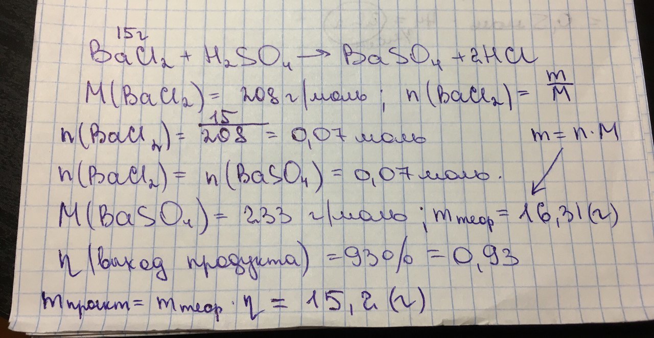 Пожалуйста помогите!!Чему равна масса практическая сульфата бария, который получен при взаимодействии 15г хлорида бария с серной кислотой, если выход продукта составляет 93%.