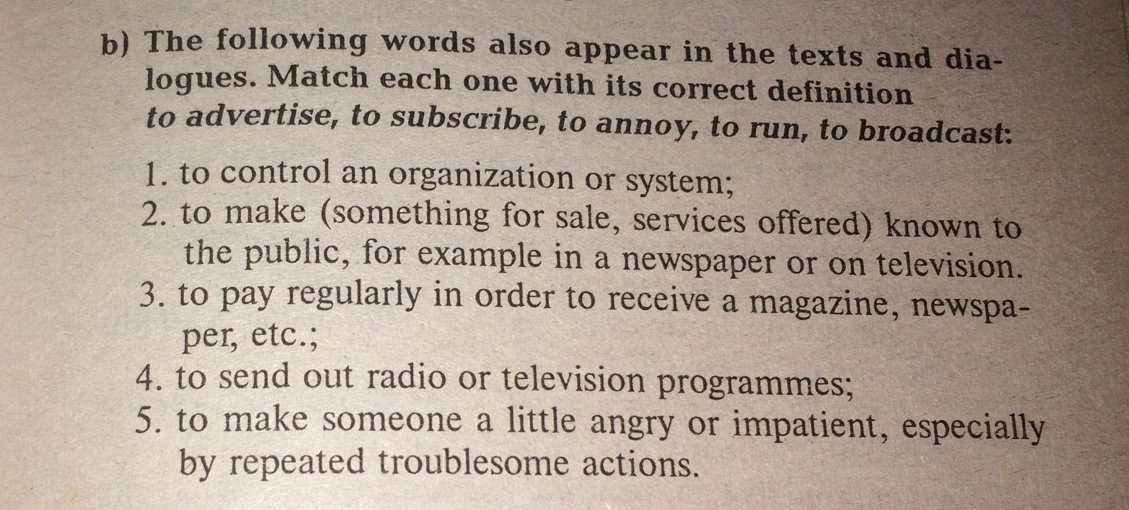 Следующие слова также появляются в текстах и ответах. Сопоставьте каждый с его правильным определением, чтобы рекламировать, подписываться, раздражать, запускать, транслировать: