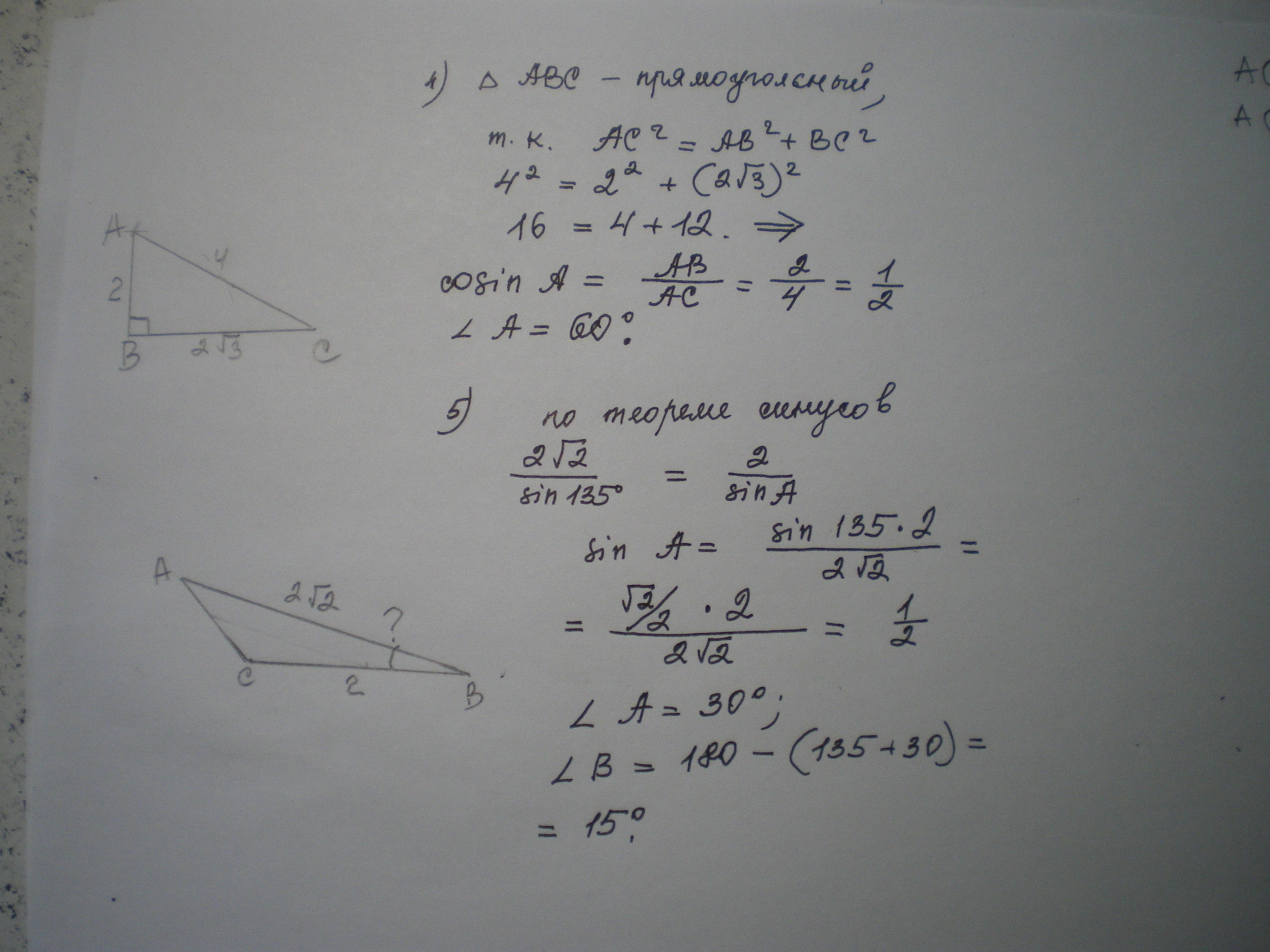 Задача №5. Найти угол B. сторона AB=2 корня из 2. BC=2. угол C=135 градусам