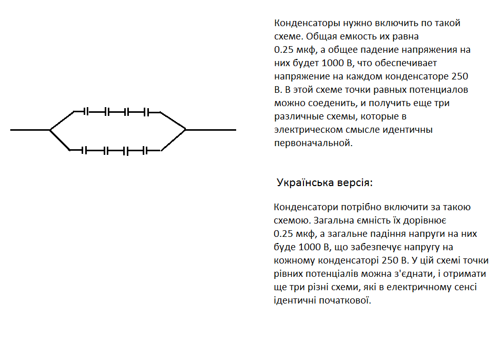 Єсть певна кількість конденсаторів ємністю 0,5 мікрофарат кожен зних розрахований на роботу 250 вольт з цих конденсаторів нада собрать батарею 0,25 микрофарат в електричному полі напругою 1000 вольт