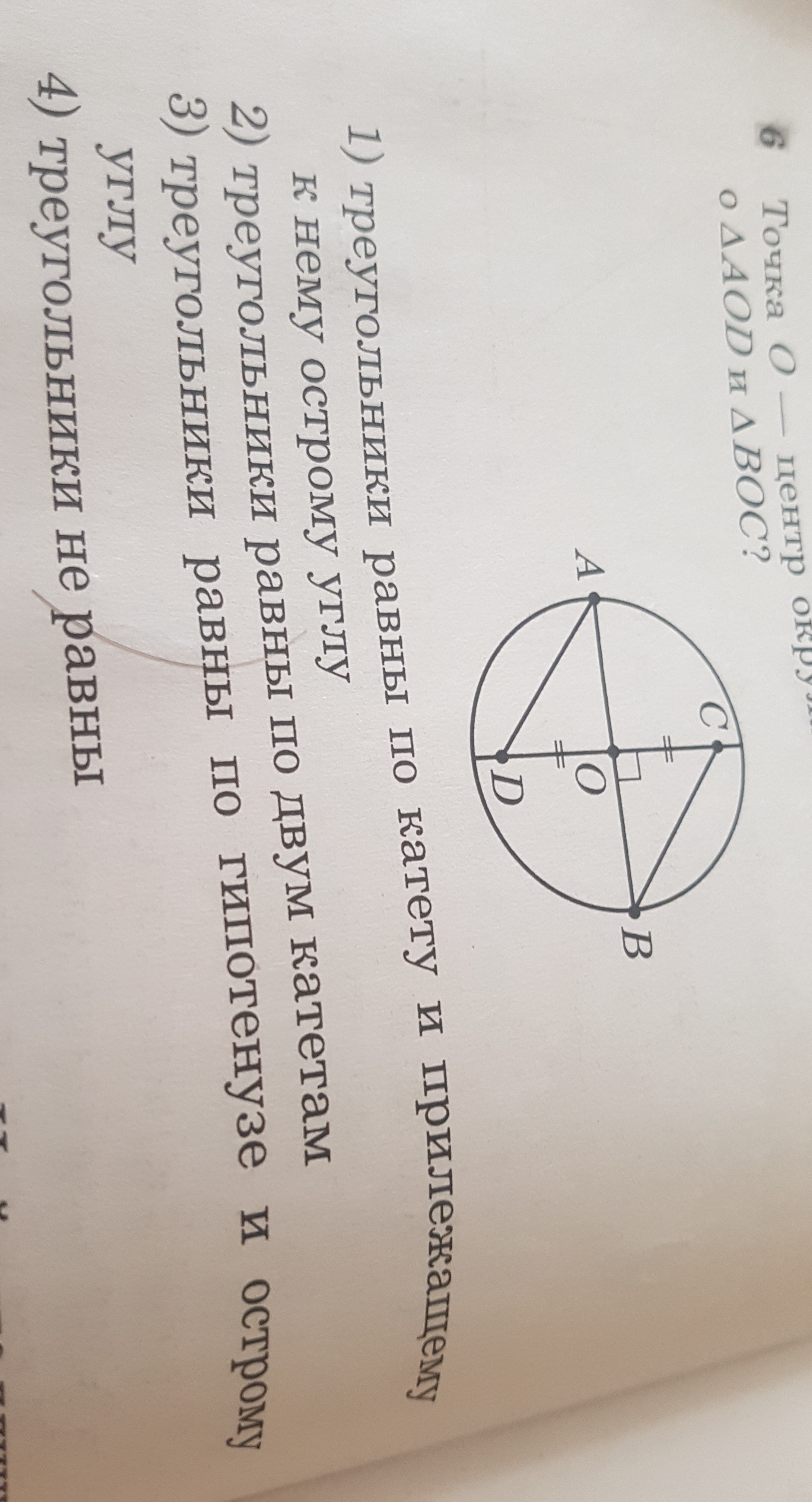 точка O - центр окружности. Что можно сказать о треугольнике AOD и треугольнике BOC?