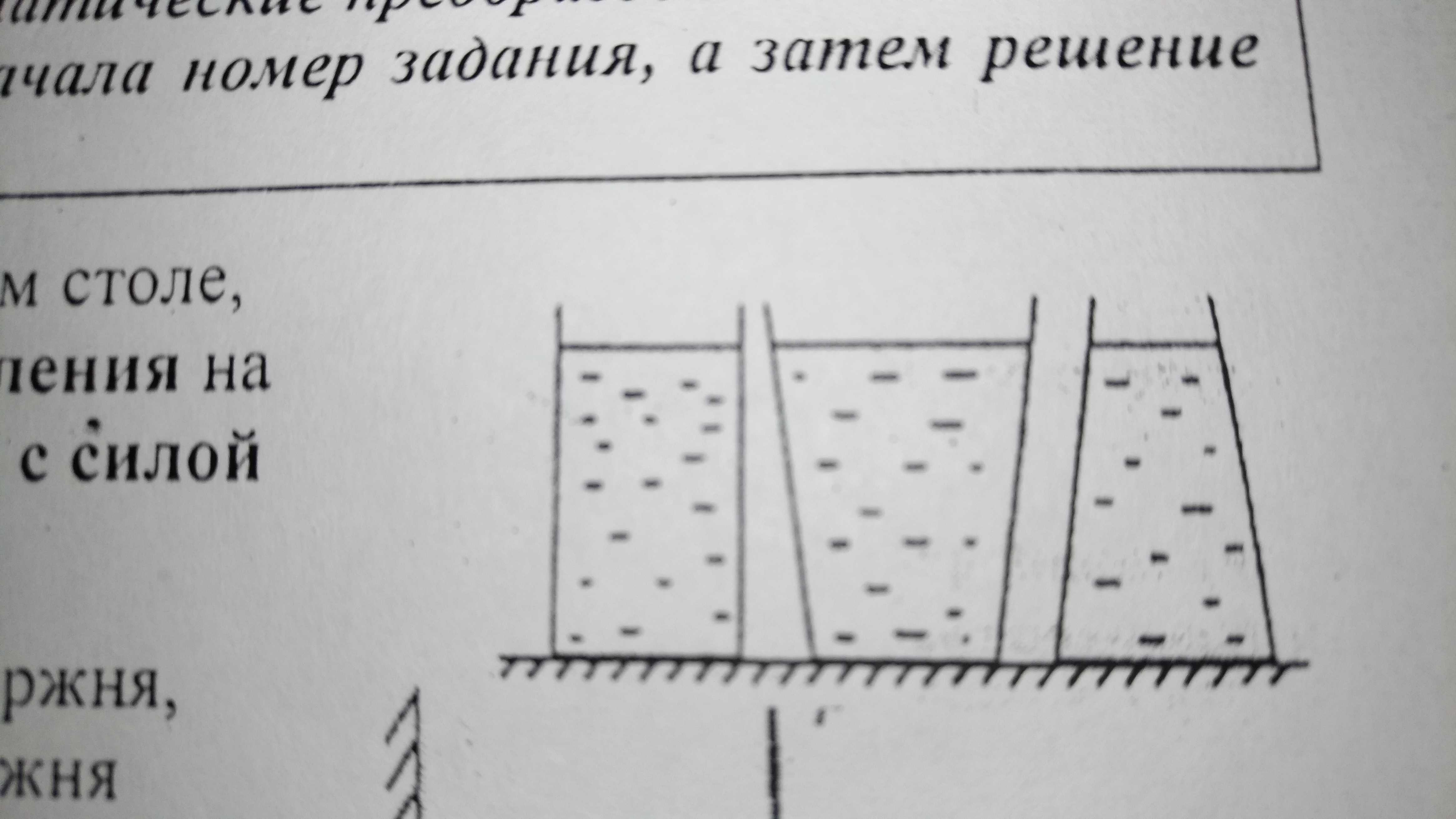 В трёх сосудах с одинаковой площадью дна, стоящих на горизонтальном столе налита однородная жидкость. Сравните силы гидростатического давления на дно этих сосудов. Сравните для каждого сосуда вес налитой жидкости с силой гидростатического давления на дно.