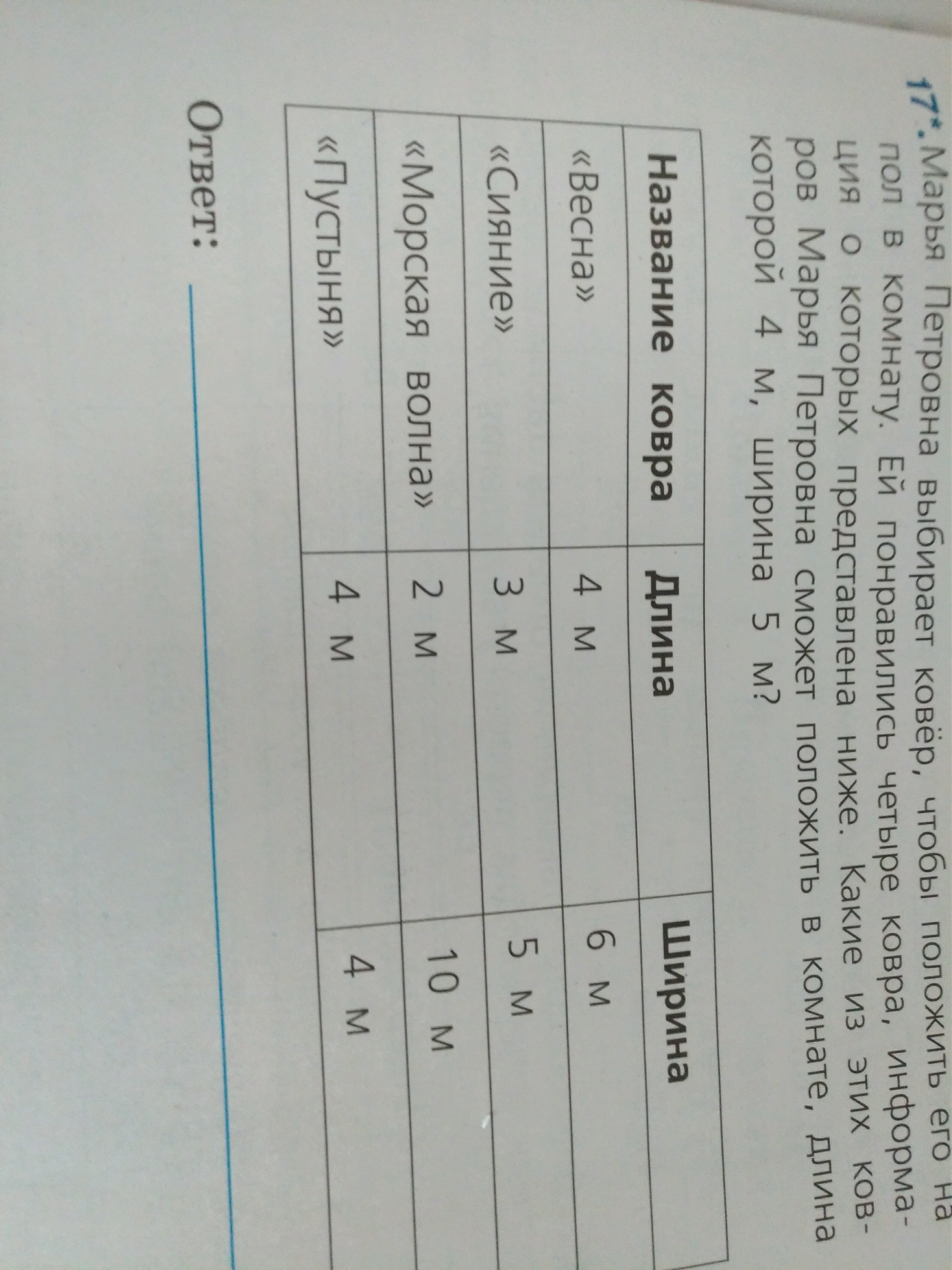 Мария Петровна выбирает ковер чтобы положить его на пол в комнату ей понравились 4 ковра информация о которых предоставлена ниже Какие из этих Ковров Марья Петровна сможет положить в комнате длина которой 4 м ширина 5 м