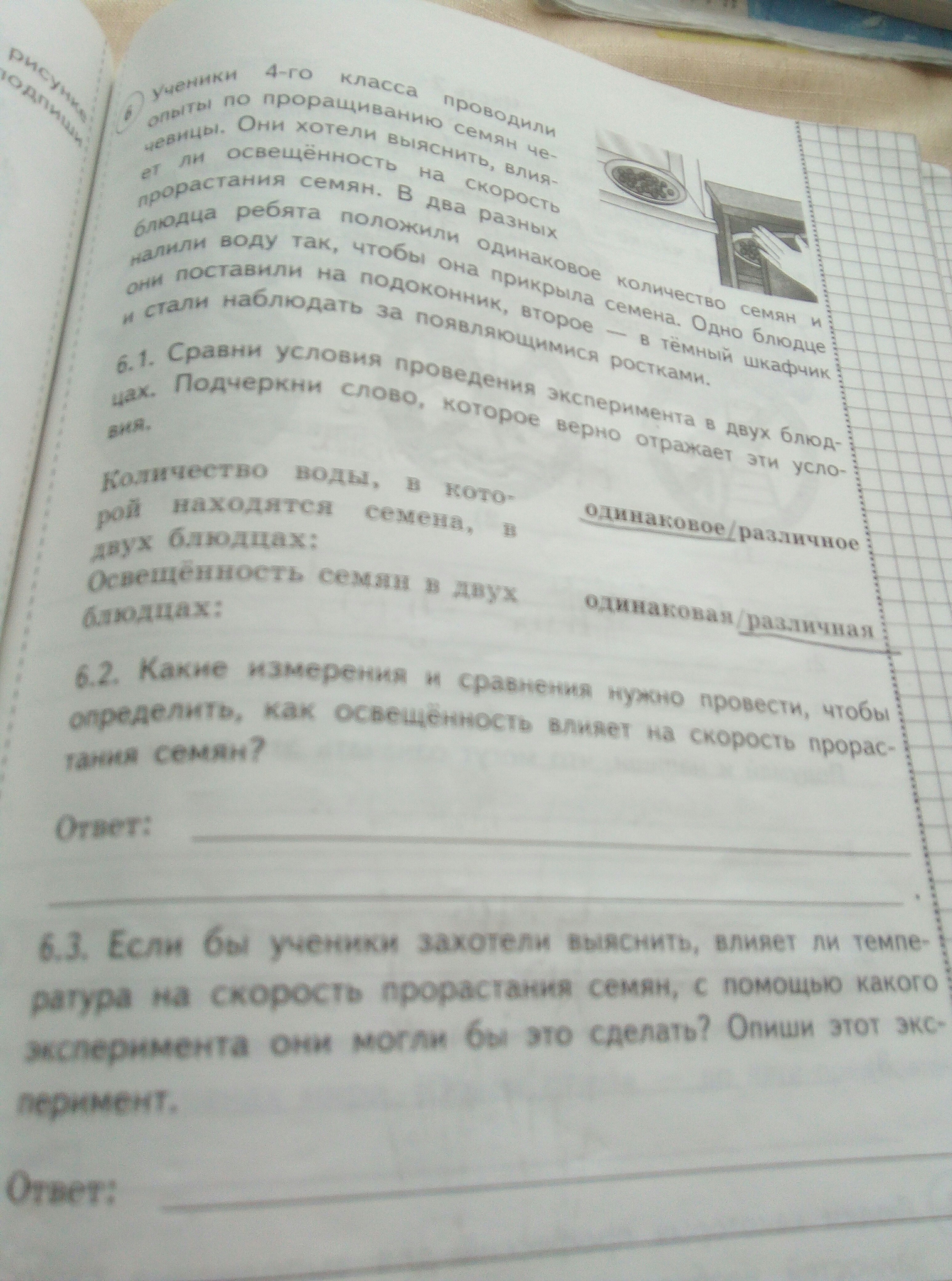 6.3. Если бы ученики захотели выяснить, влияет ли температура на скорость проростания семян, с помощью какого эксперимента они могли бы это сделать? Опиши этот эксперимент.